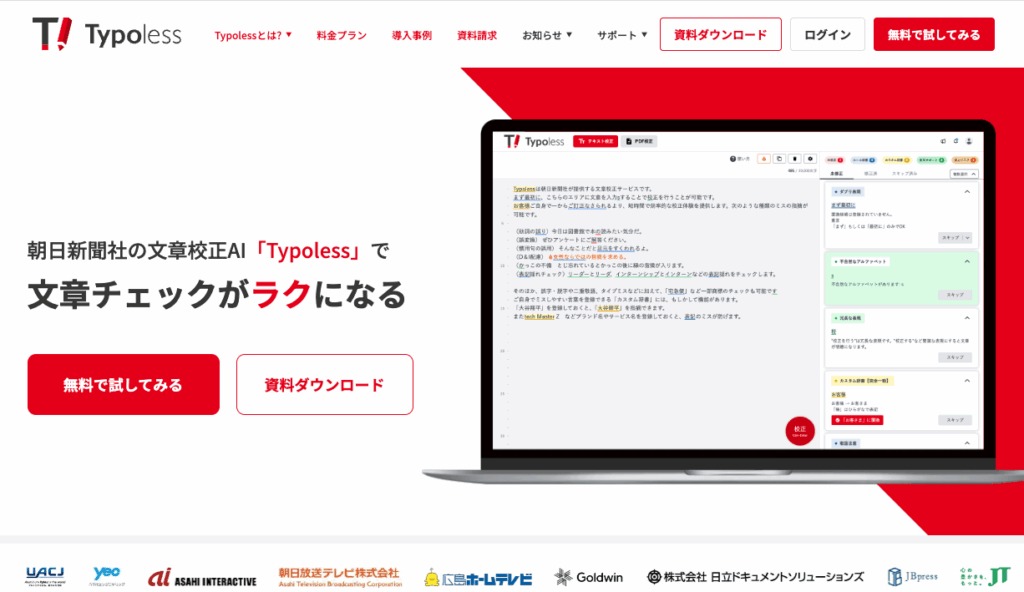 Typolessは、株式会社朝日新聞社が提供する文章校正AIツールです。同社に蓄積された膨大な過去の校正データをもとに、精度の高い校正支援が受けられます。