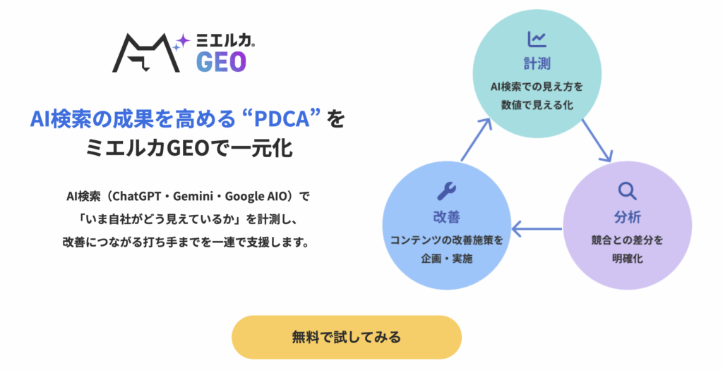 ・ツールを試してみたい➡︎ LLMO(GEO) 支援ツール「ミエルカGEO」