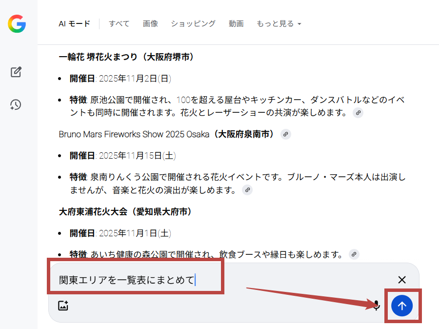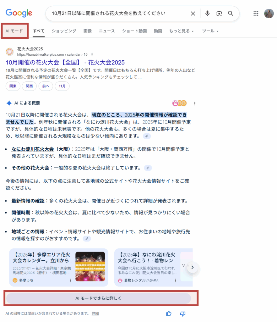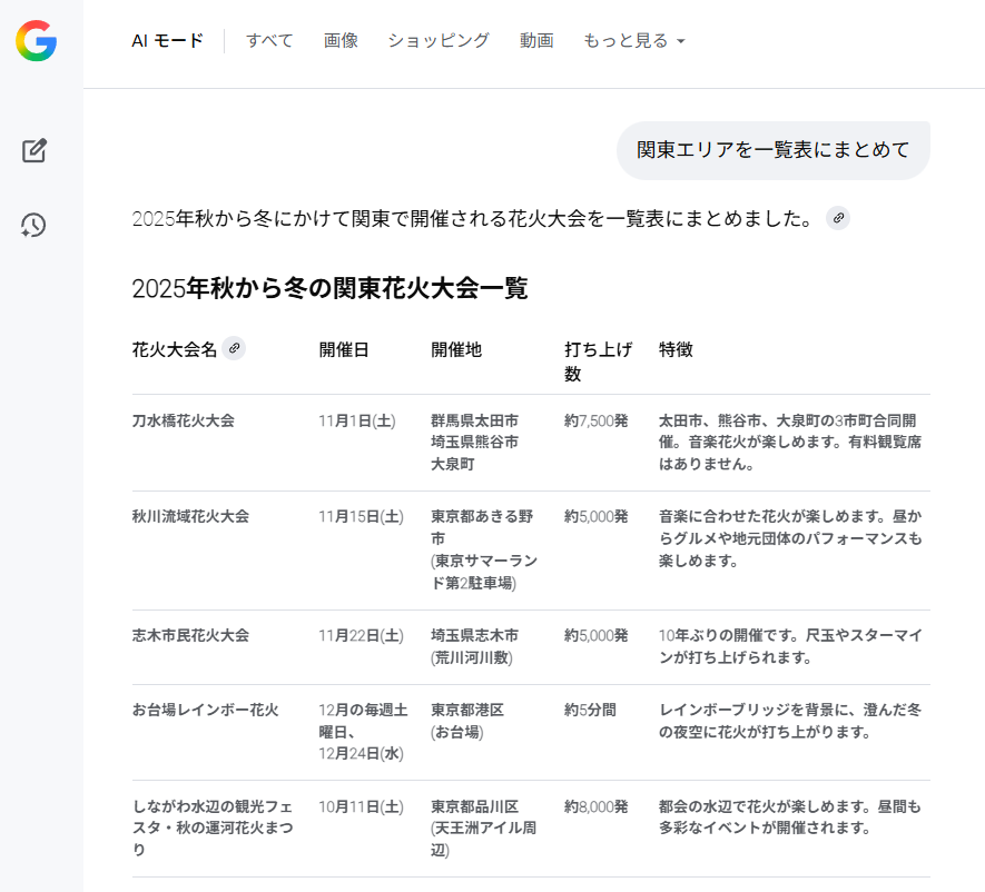 これに対し、AI Modeではユーザーの質問やキーワードに対して、AIがWeb上の情報を自動で要約。要点をまとめた回答を提示してくれます。