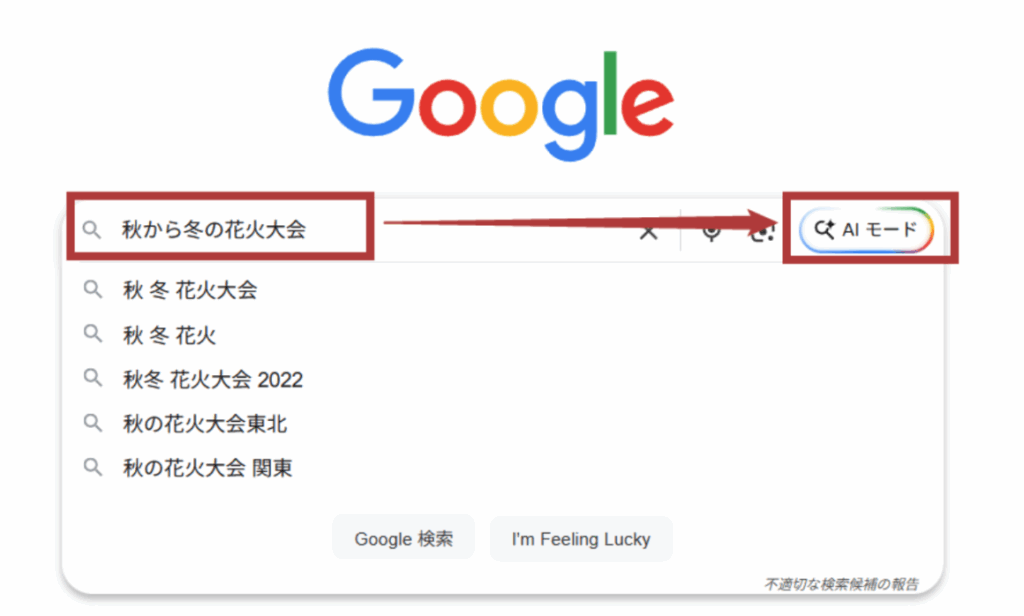 通常検索を行ったあと、検索結果ページの「AIモード」タブや「AIによる概要」下部にある「AIモードでさらに詳しく」をクリックすると切り替えられます。