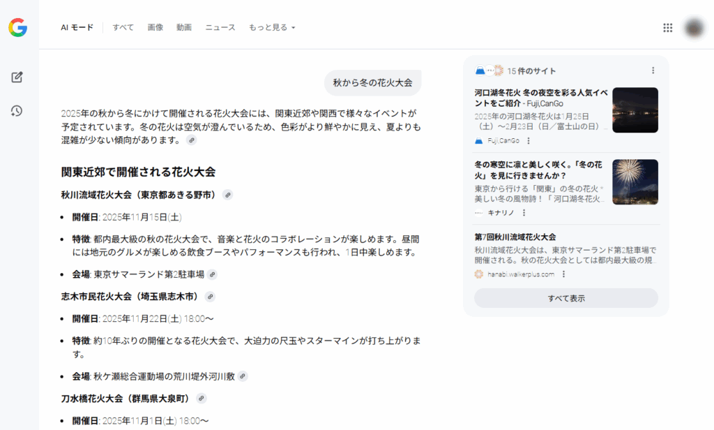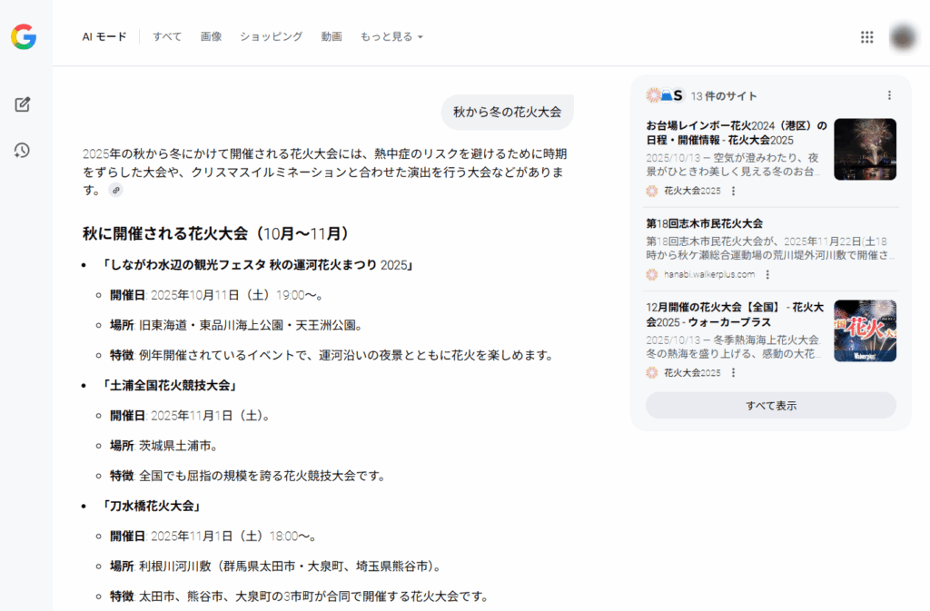 アメリカ・インド・イギリスと順に公開され、日本を含む180ヵ国でも2025年8月21日から段階的に導入が始まりました。そして2025年9月9日、ついに日本語導入が正式に発表され、現在では公開が完了しています。AIが要約や会話形式で答えてくれることで、従来の検索よりも直感的に情報を得られるのが大きな特徴です。以下のような形で利用が可能です。