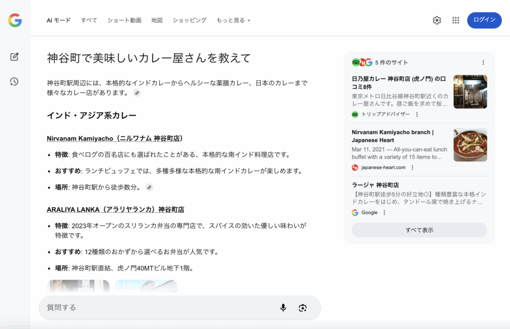 近隣の美味しいカレー屋さんを質問したAIモードの回答(2025年11月時点)