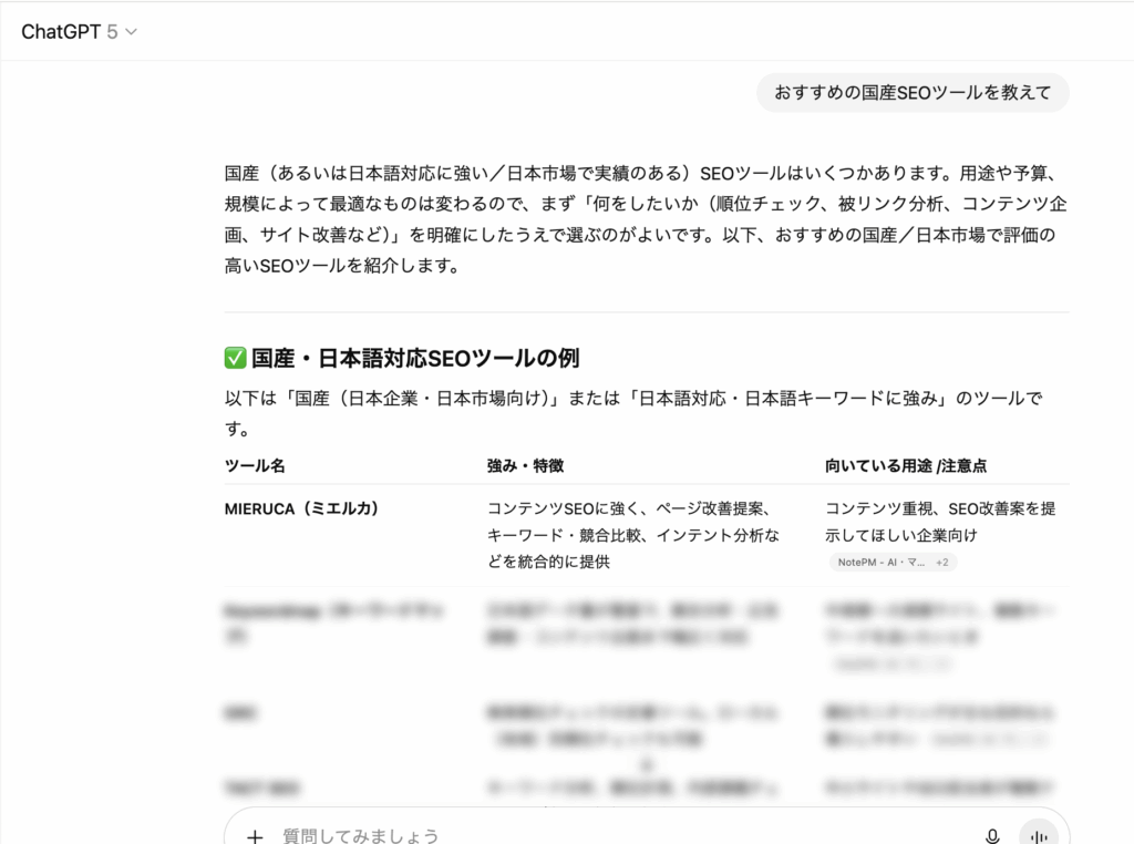 こうしたプロンプトを繰り返し投げ、回答に自社のブランドやサービス名が含まれていなければ、なぜ取り上げられないのかを直接AIに尋ねることで原因を探ることもできます。さらに、「どのような質問なら自社ブランドを表示してくれるのか」という視点も合わせて確認すると、取り組むべき施策が見えてきます。
