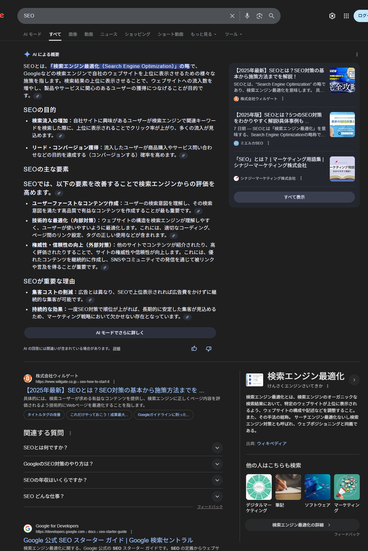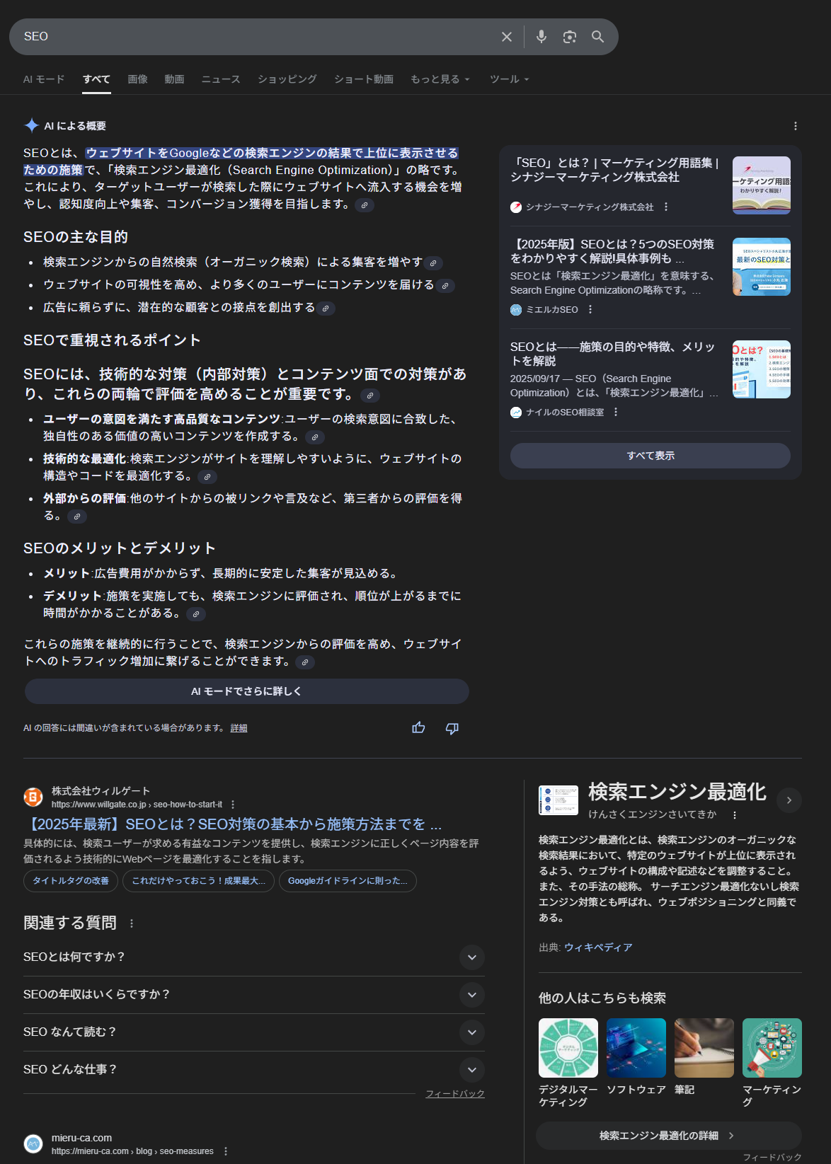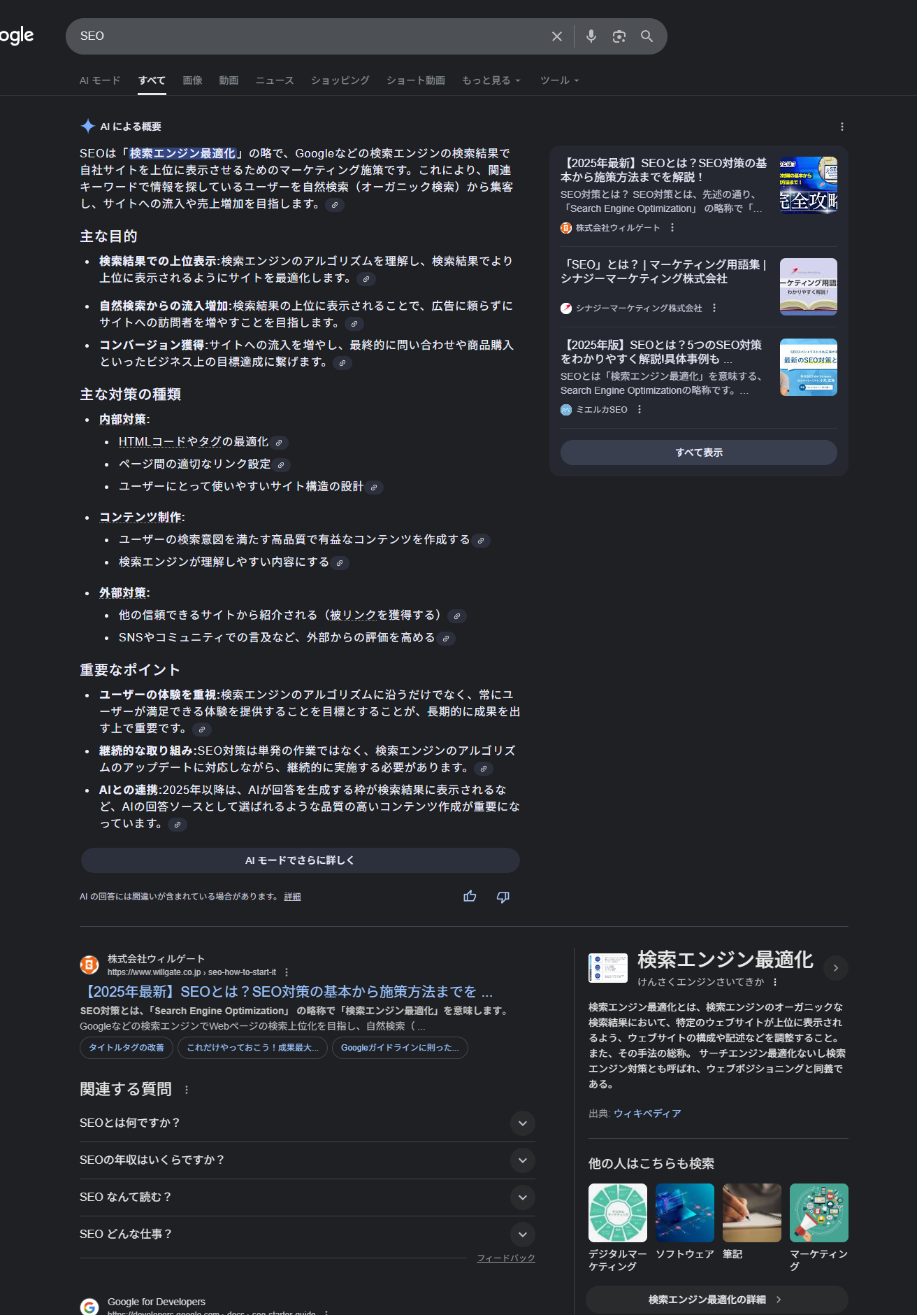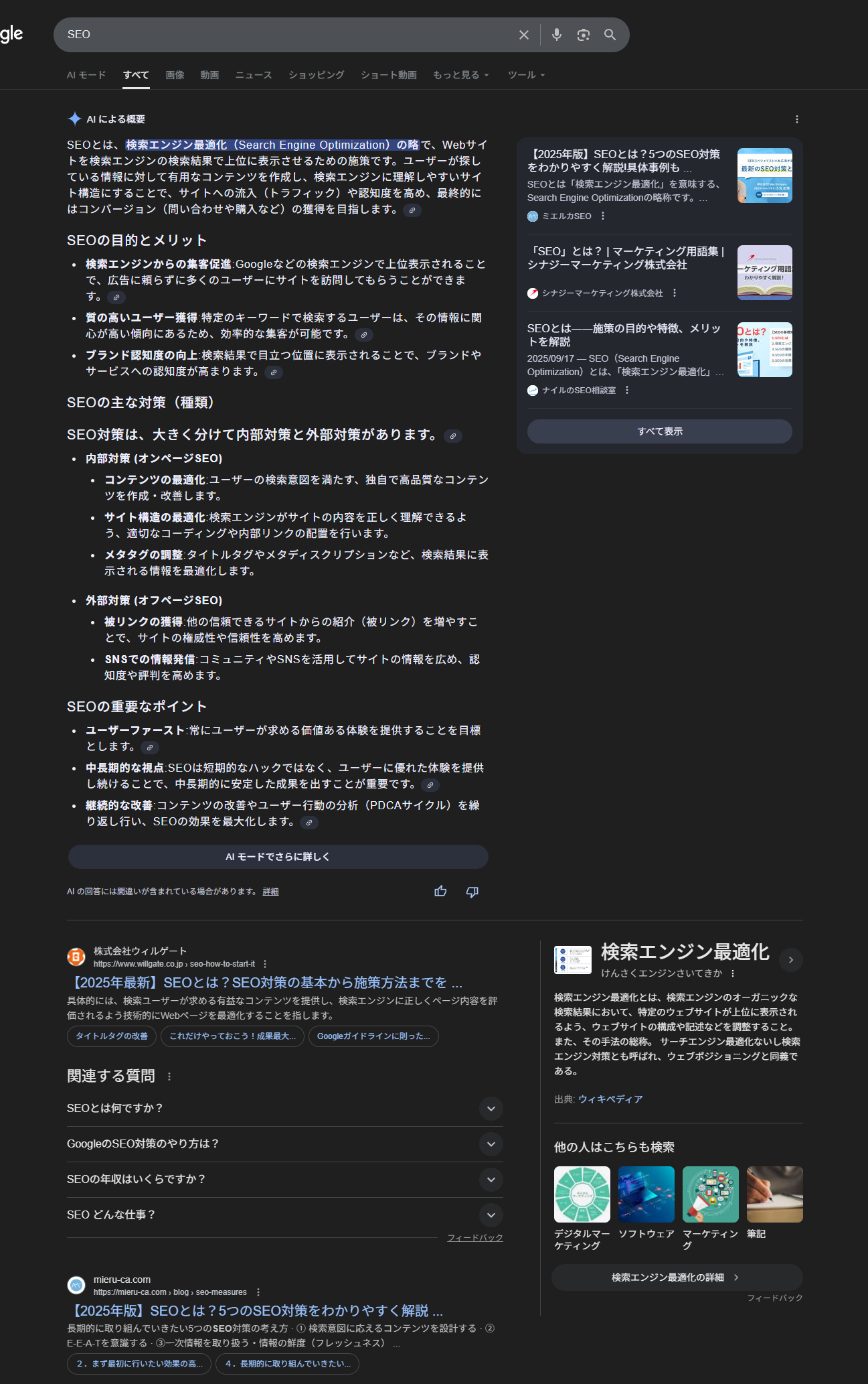 前回9月26日の計測では、【クレジットカード おすすめ】にAI Overviewsが表示されていた。しかし本日の計測では、AI Overviewsが見られず、再び比較サイトが中心に。一方で【SEO】や【生成AIとは】など情報型クエリでは解説が整理され、課題や従来技術との比較も追加された。【クレジットカード おすすめ】のような購買系クエリにAI Overviewsが表示されないのは一時的か、傾向か、今後の動向も注目したい。