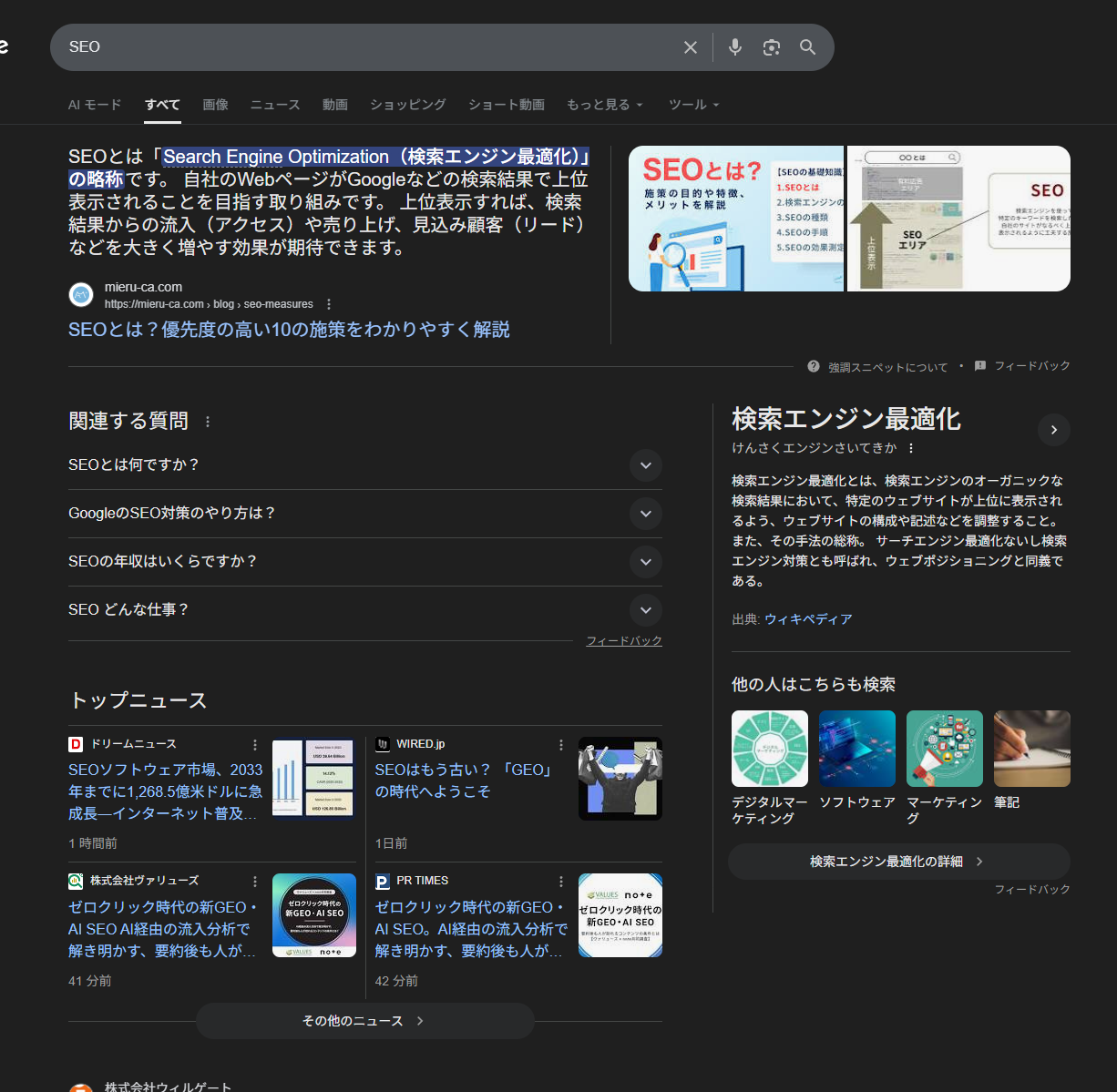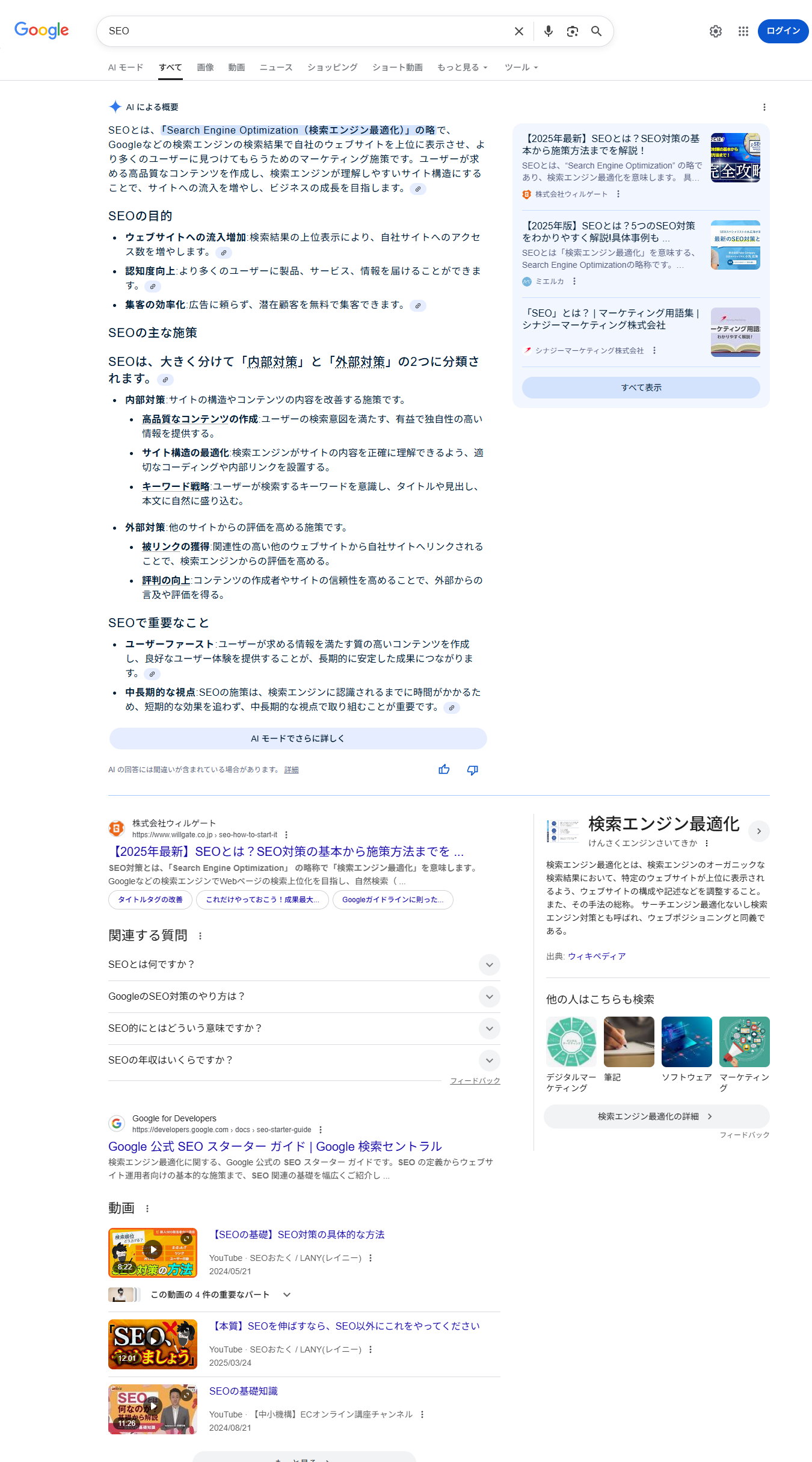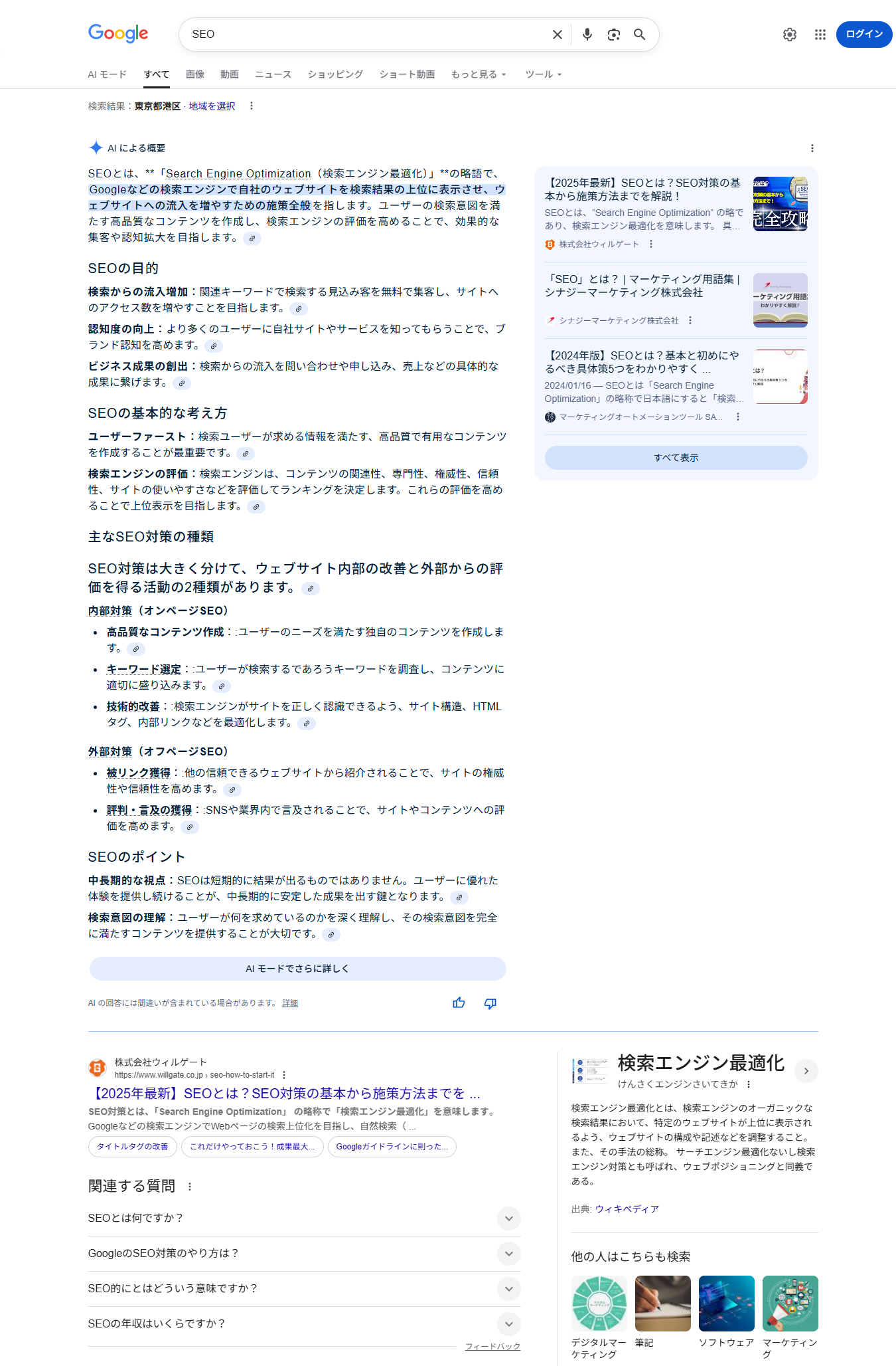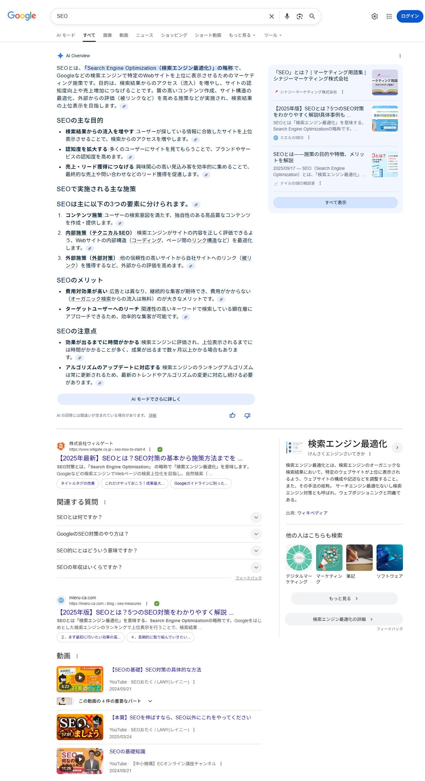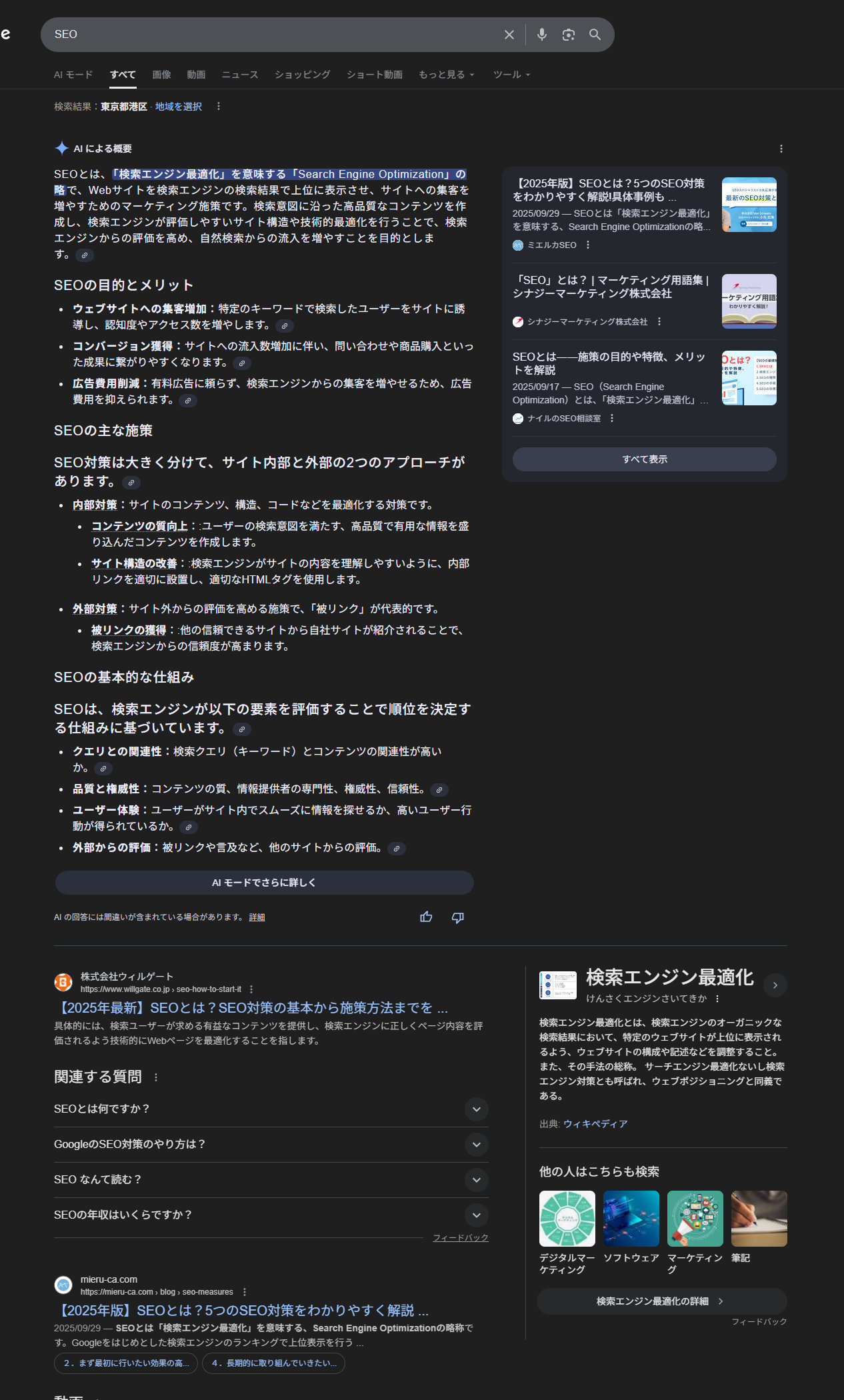 前回9月26日の計測では、【クレジットカード おすすめ】にAI Overviewsが表示されていた。しかし本日の計測では、AI Overviewsが見られず、再び比較サイトが中心に。一方で【SEO】や【生成AIとは】など情報型クエリでは解説が整理され、課題や従来技術との比較も追加された。【クレジットカード おすすめ】のような購買系クエリにAI Overviewsが表示されないのは一時的か、傾向か、今後の動向も注目したい。