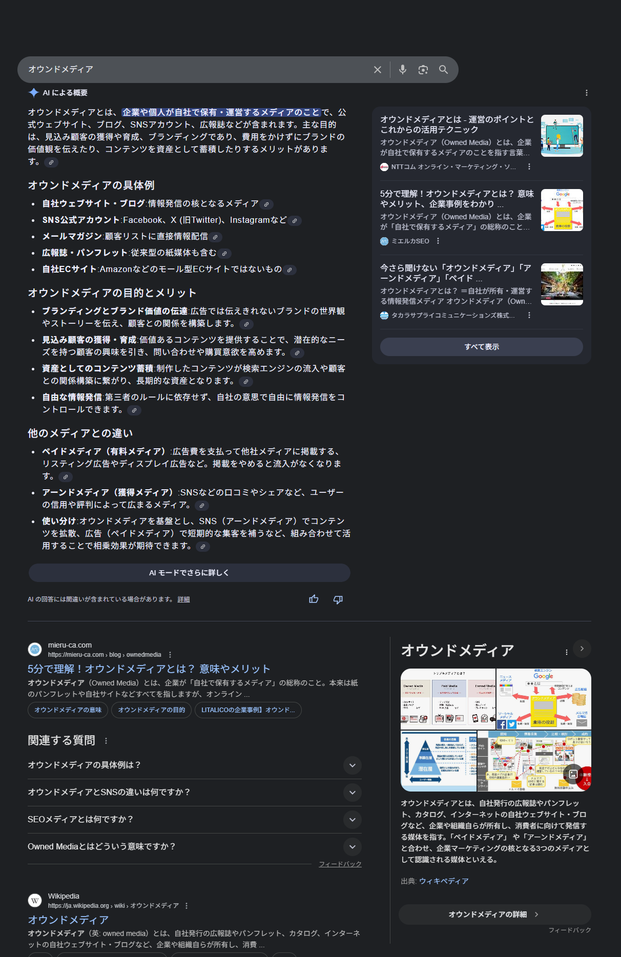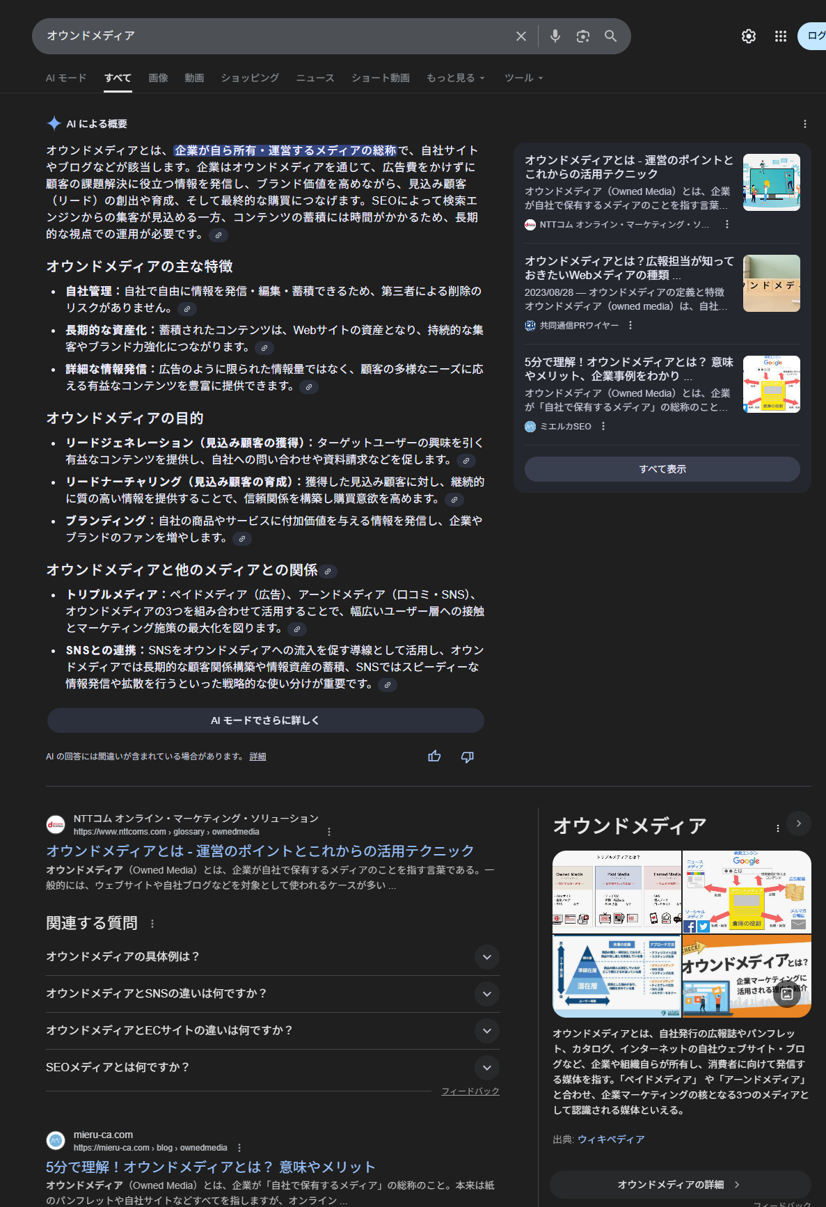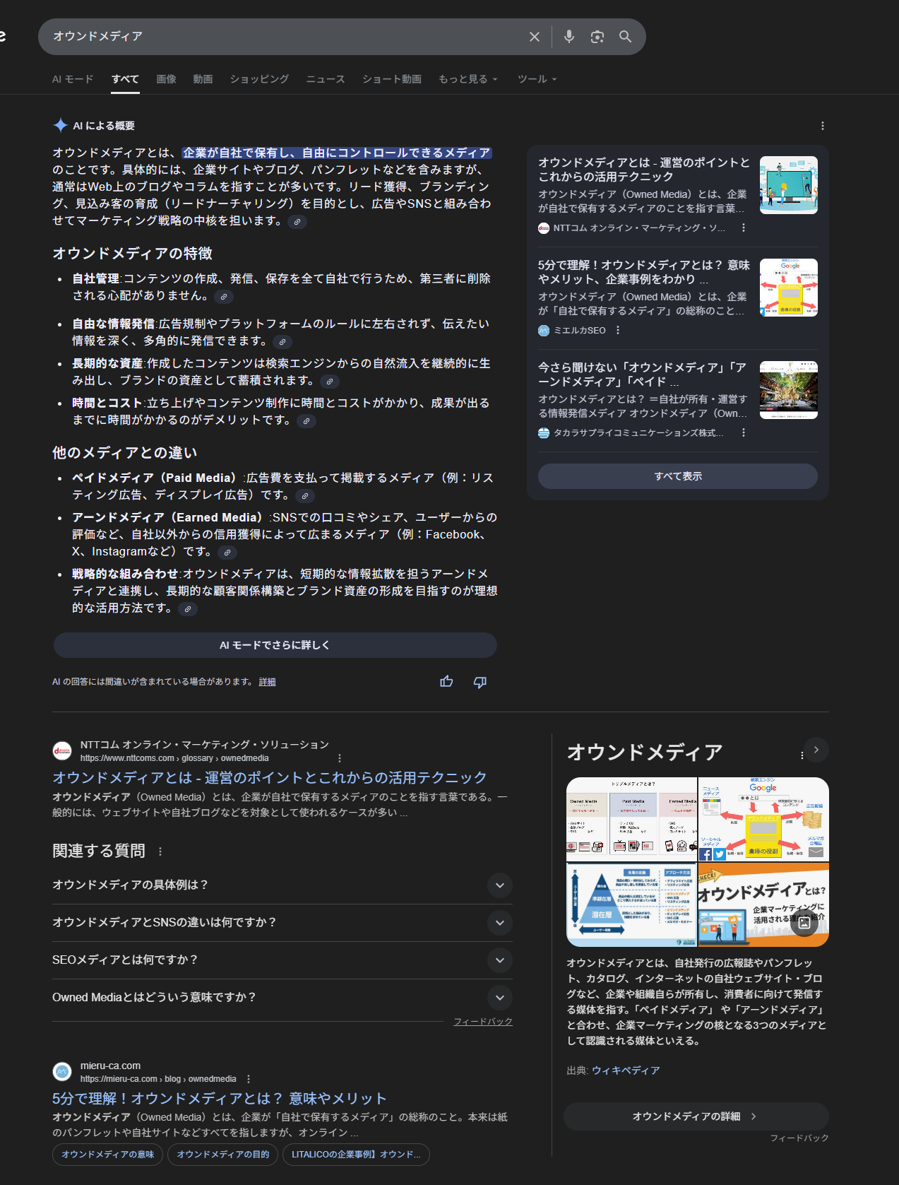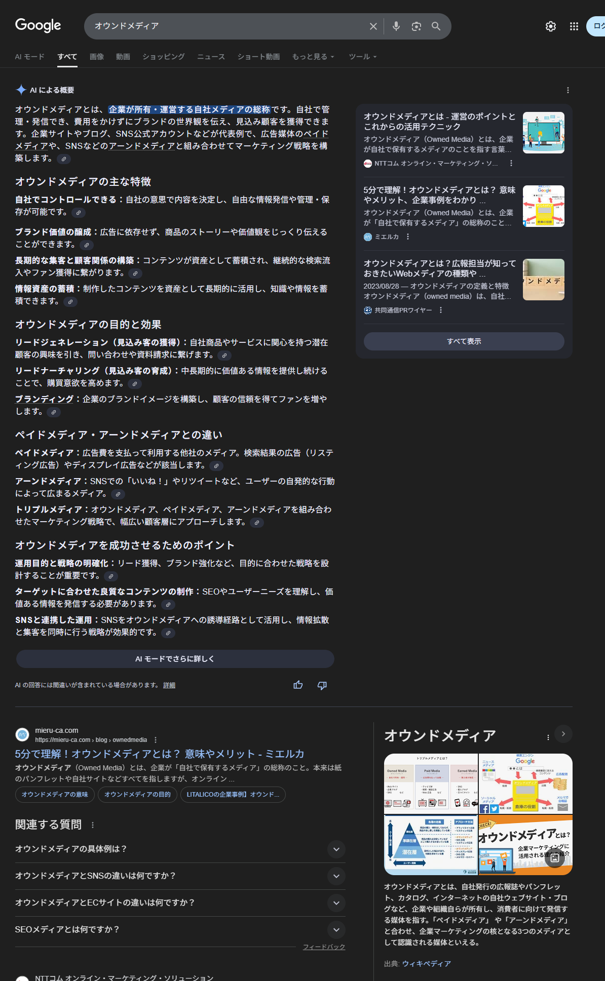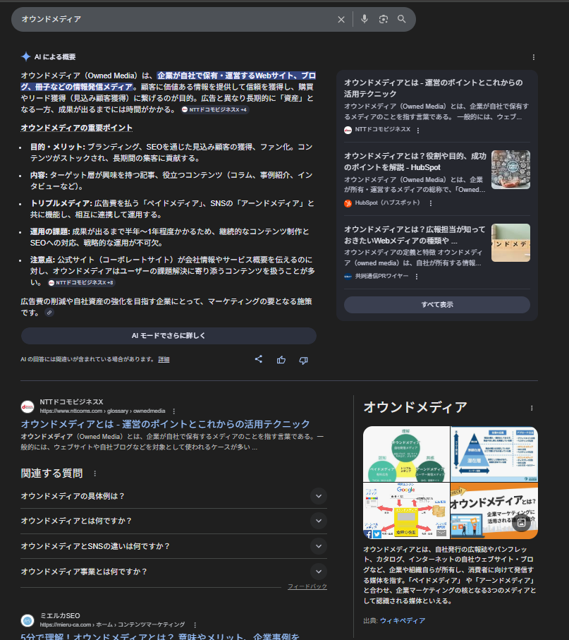 直近、AI概要欄そのものに大きな変動はない一方、SERPs全体ではAI機能の実装が進み、表示は視覚的にリッチ化。全キーワードで「関連する質問」を開くほど、各質問にAI概要が次々と追加され、“次に知りたい”を先回り提示。なお、以前からみられる傾向ではあるが、【オウンドメディア】では概念を図解した画像が表示されるなど、視覚に訴える実装も進行中。