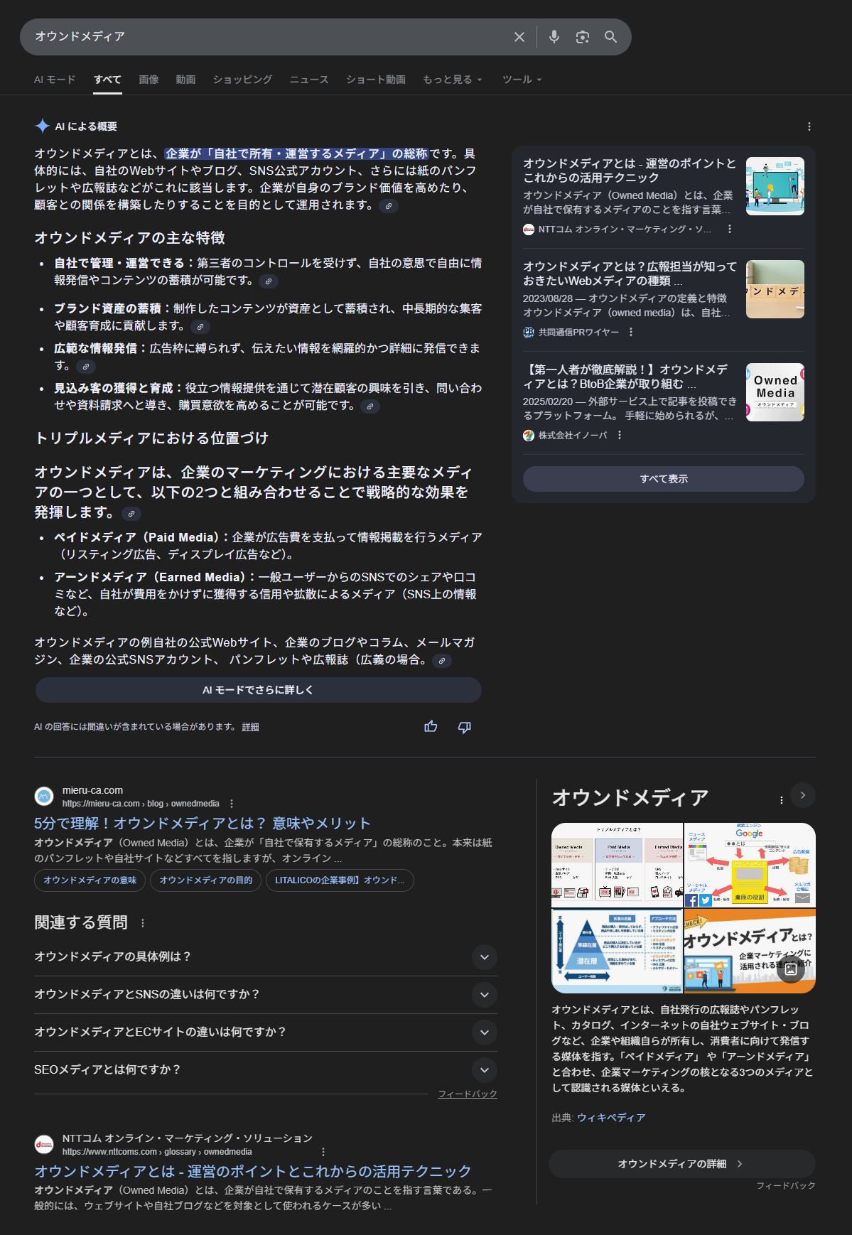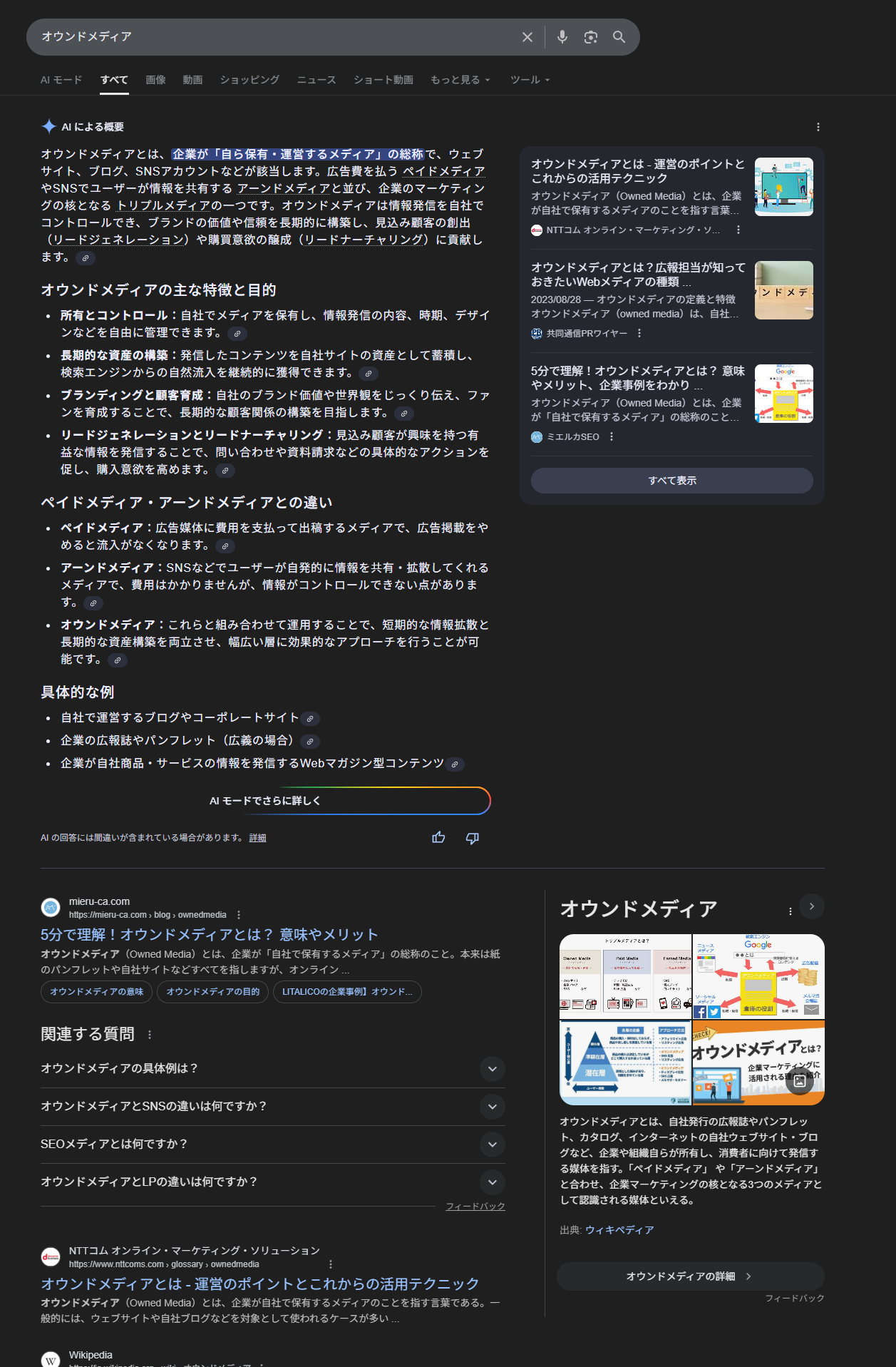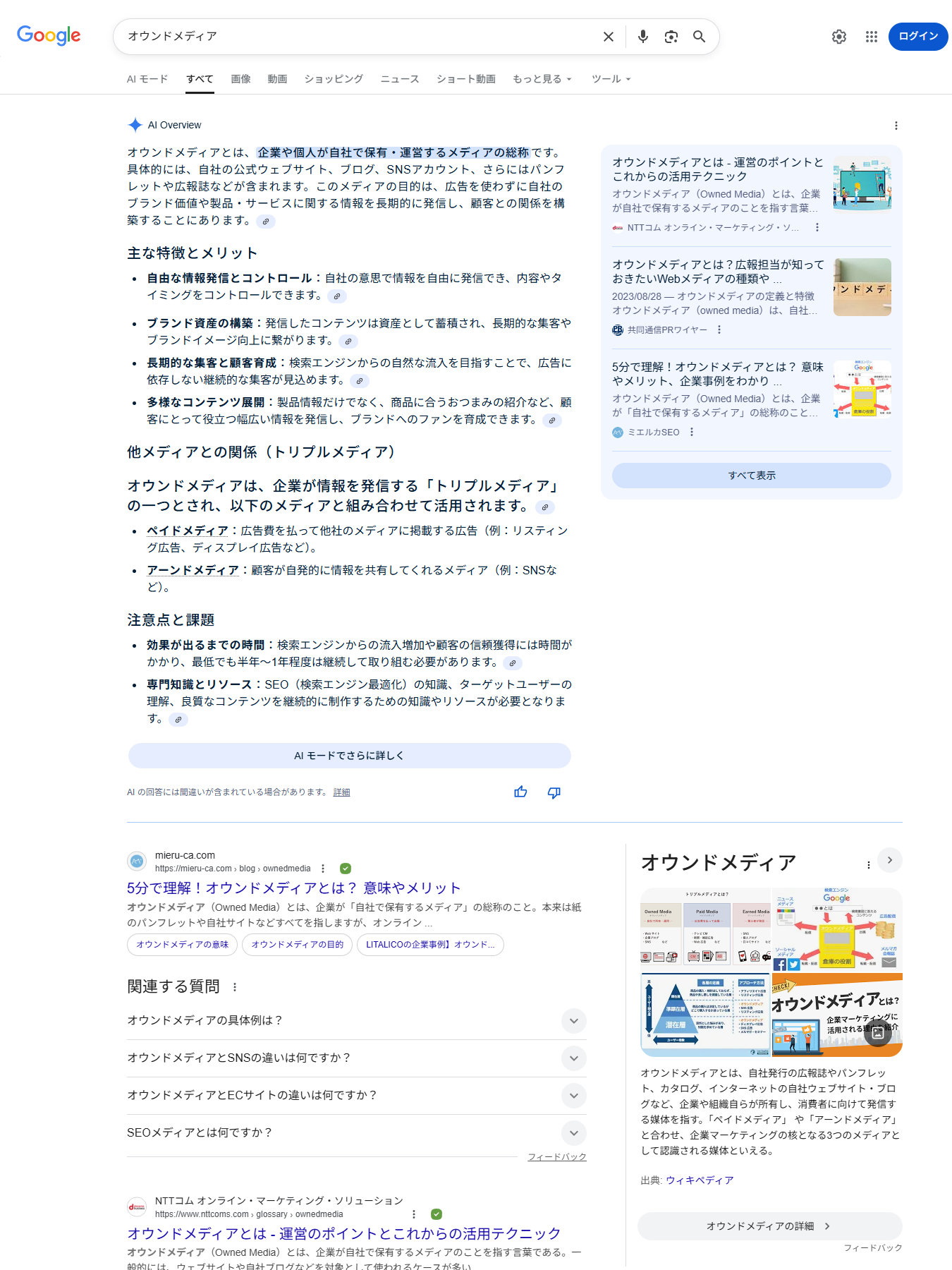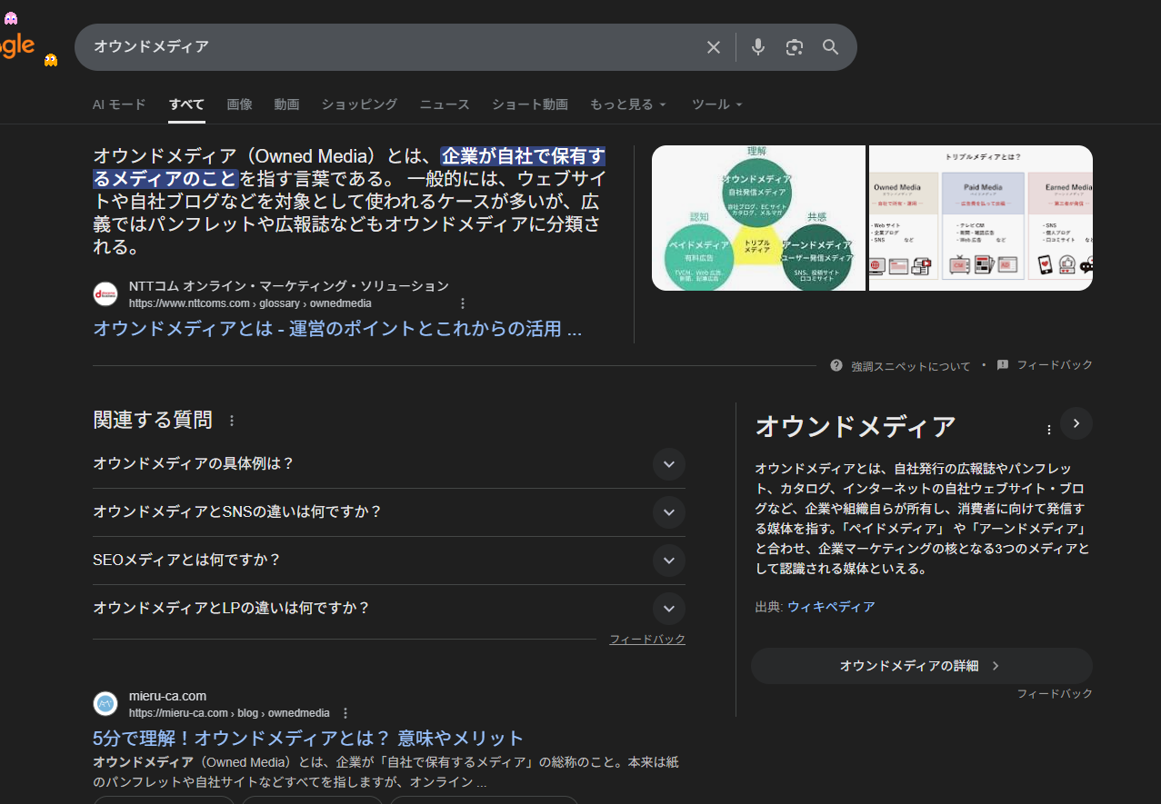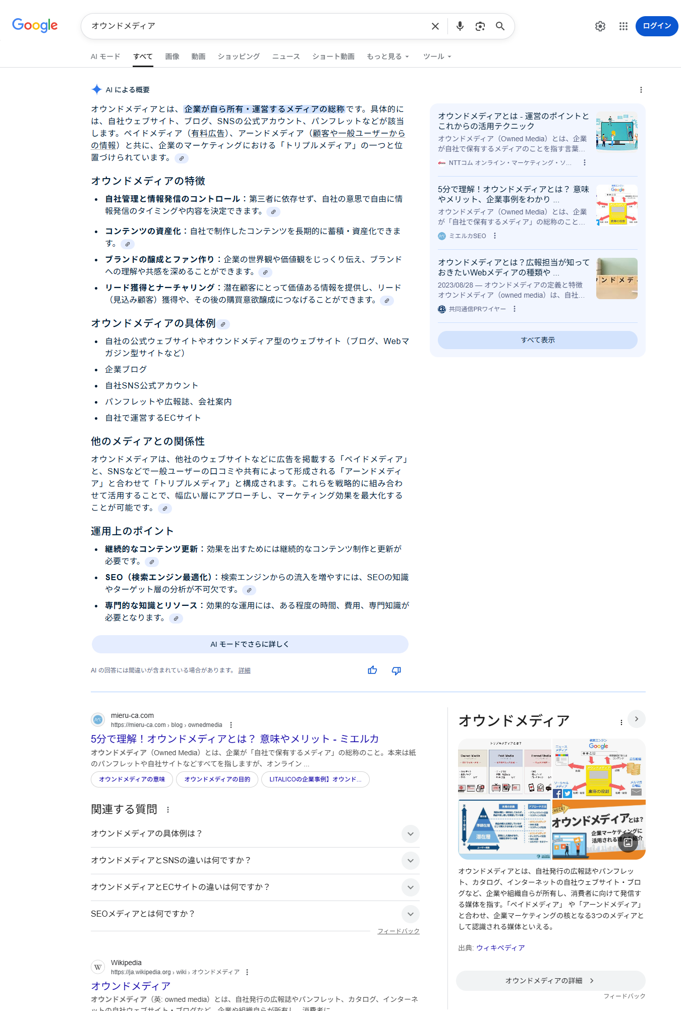 直近、AI概要欄そのものに大きな変動はない一方、SERPs全体ではAI機能の実装が進み、表示は視覚的にリッチ化。全キーワードで「関連する質問」を開くほど、各質問にAI概要が次々と追加され、“次に知りたい”を先回り提示。なお、以前からみられる傾向ではあるが、【オウンドメディア】では概念を図解した画像が表示されるなど、視覚に訴える実装も進行中。