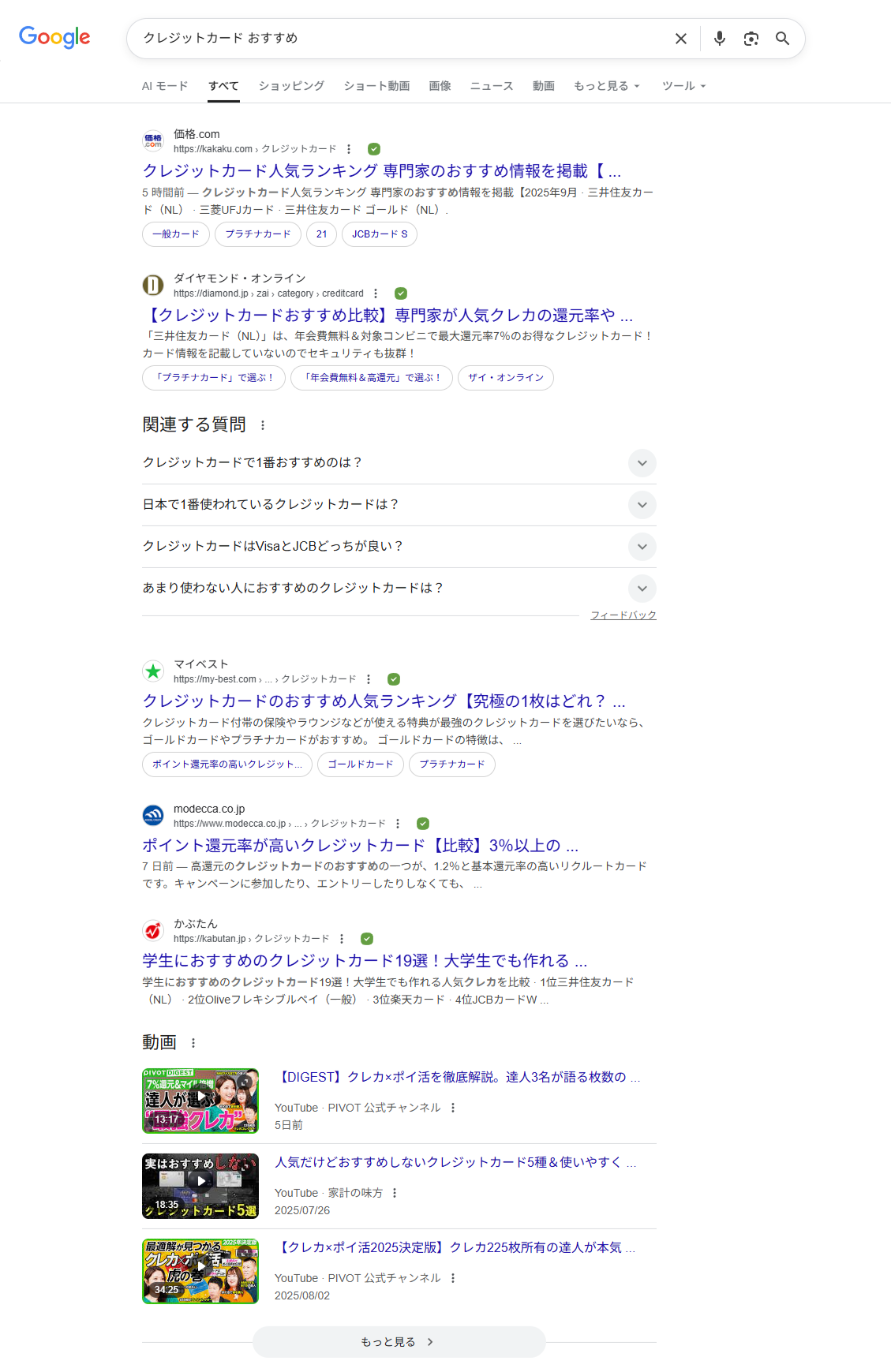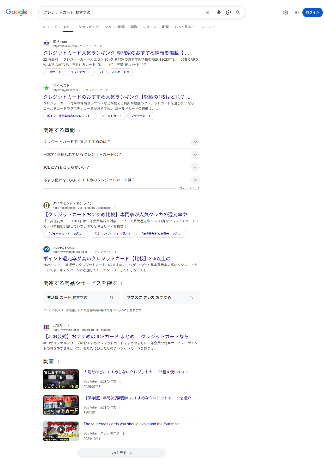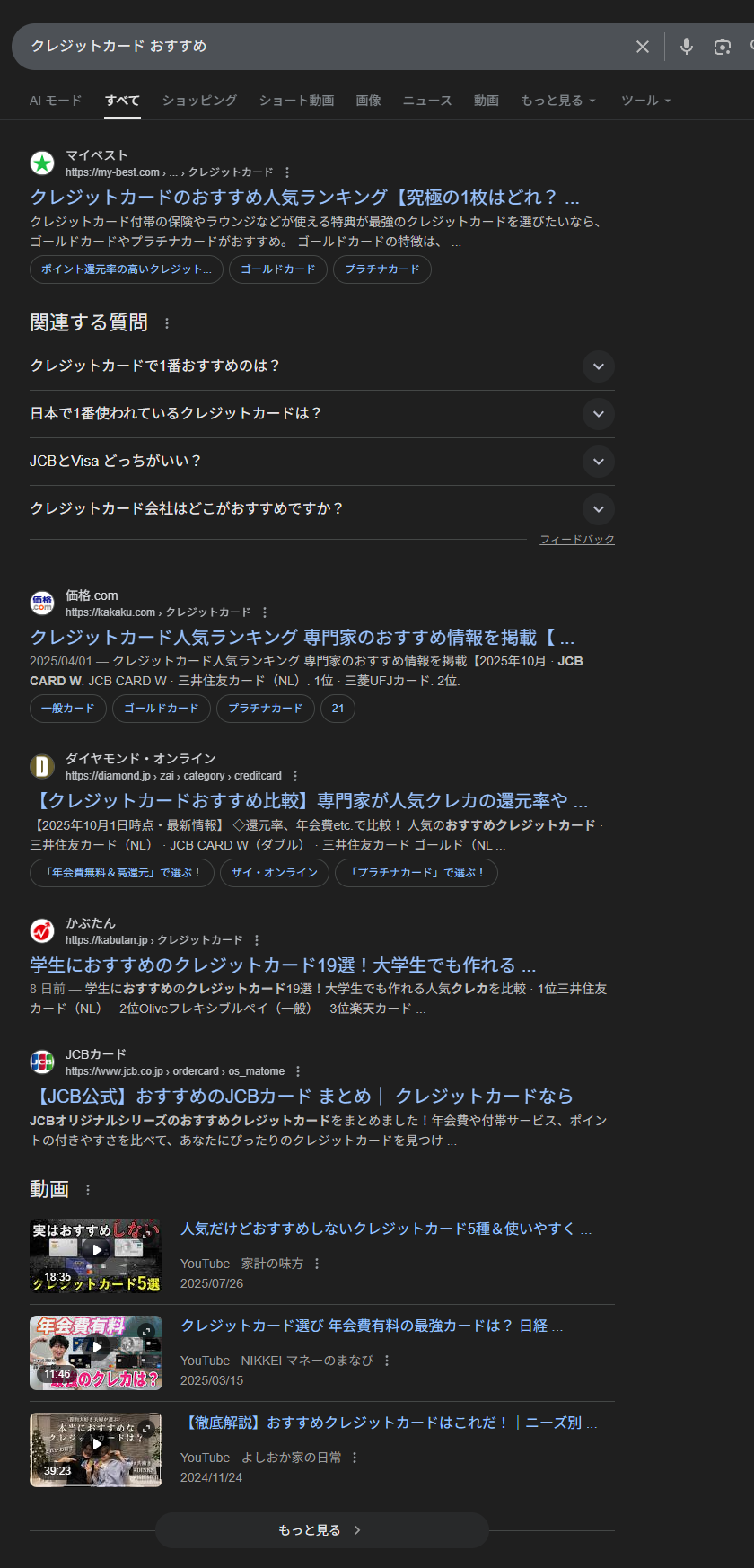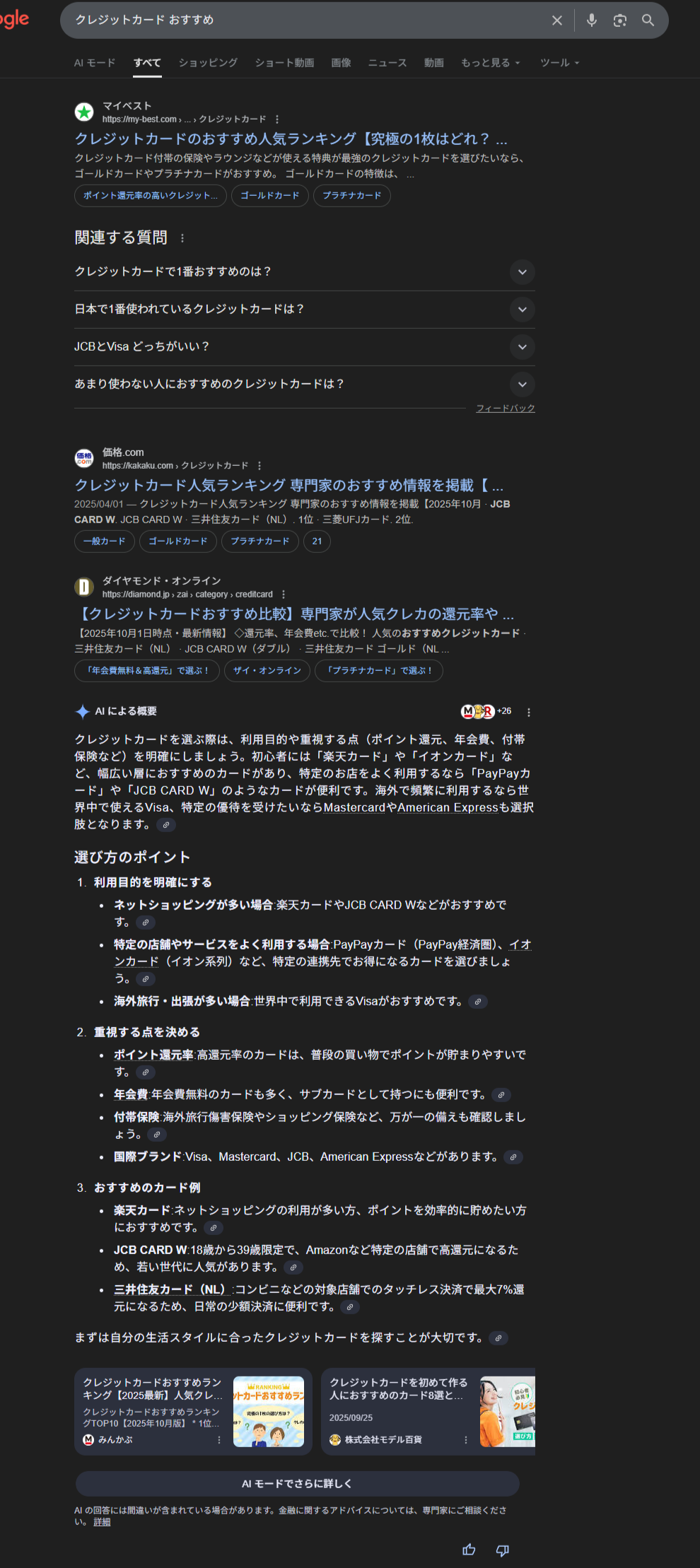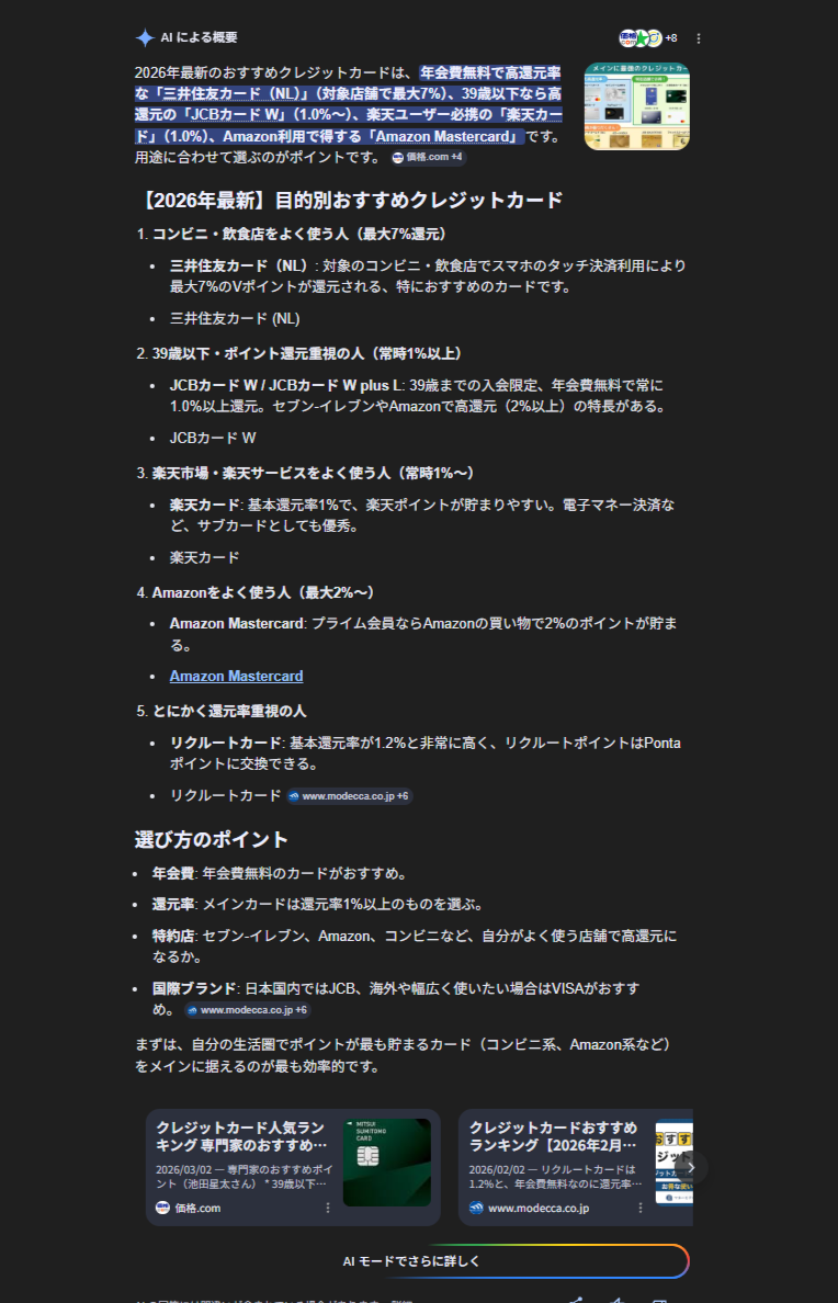【クレジットカード おすすめ】で初めてAI Overviewsが登場した。これまで情報系中心だった概要が、より購買意図の強い検索にも広がった。具体的なカード名や、選定ポイントも提示され、情報取得から商品比較まで一連を担うようになったことは検索体験の大きな転換点を示しているとも言えるのではないだろうか。