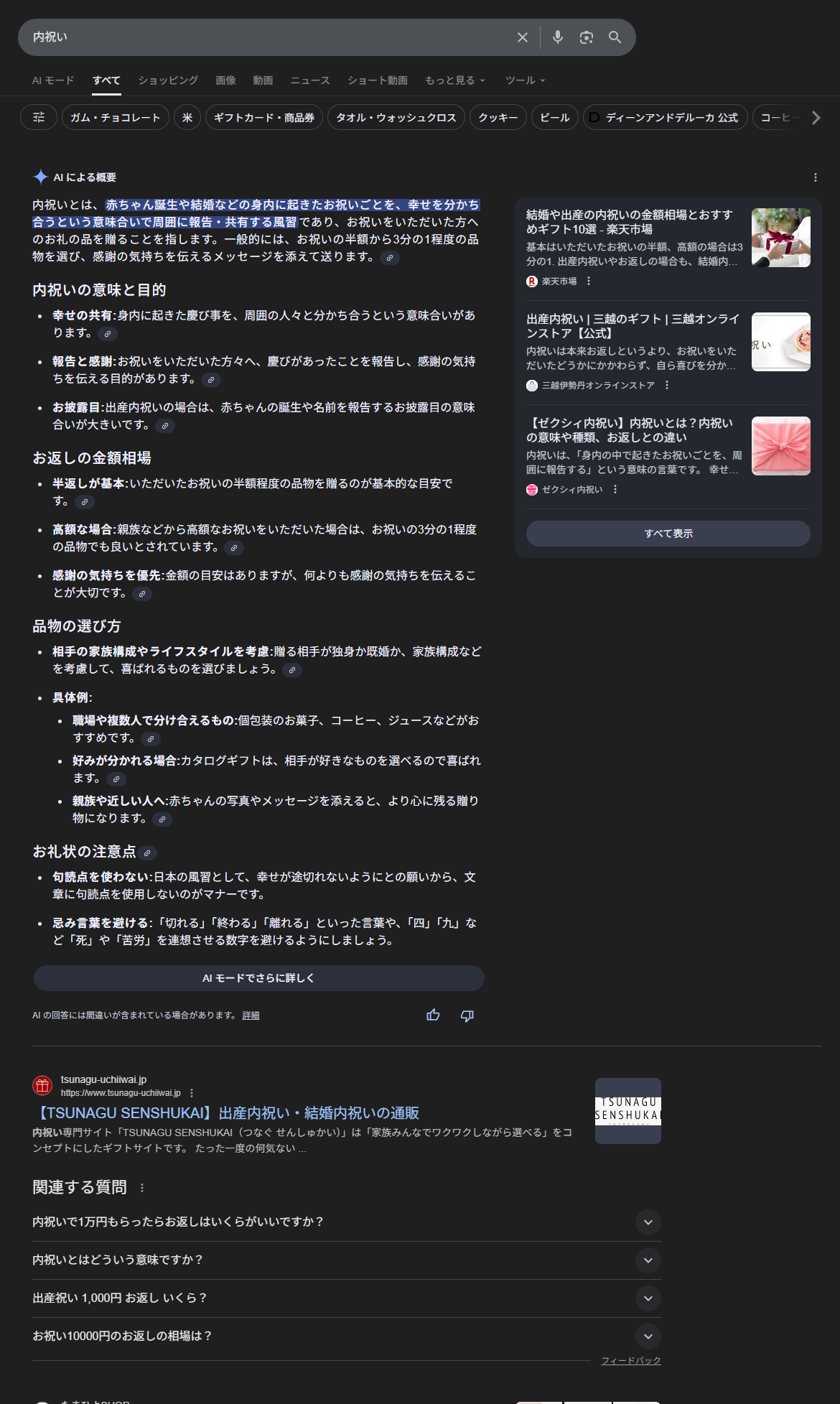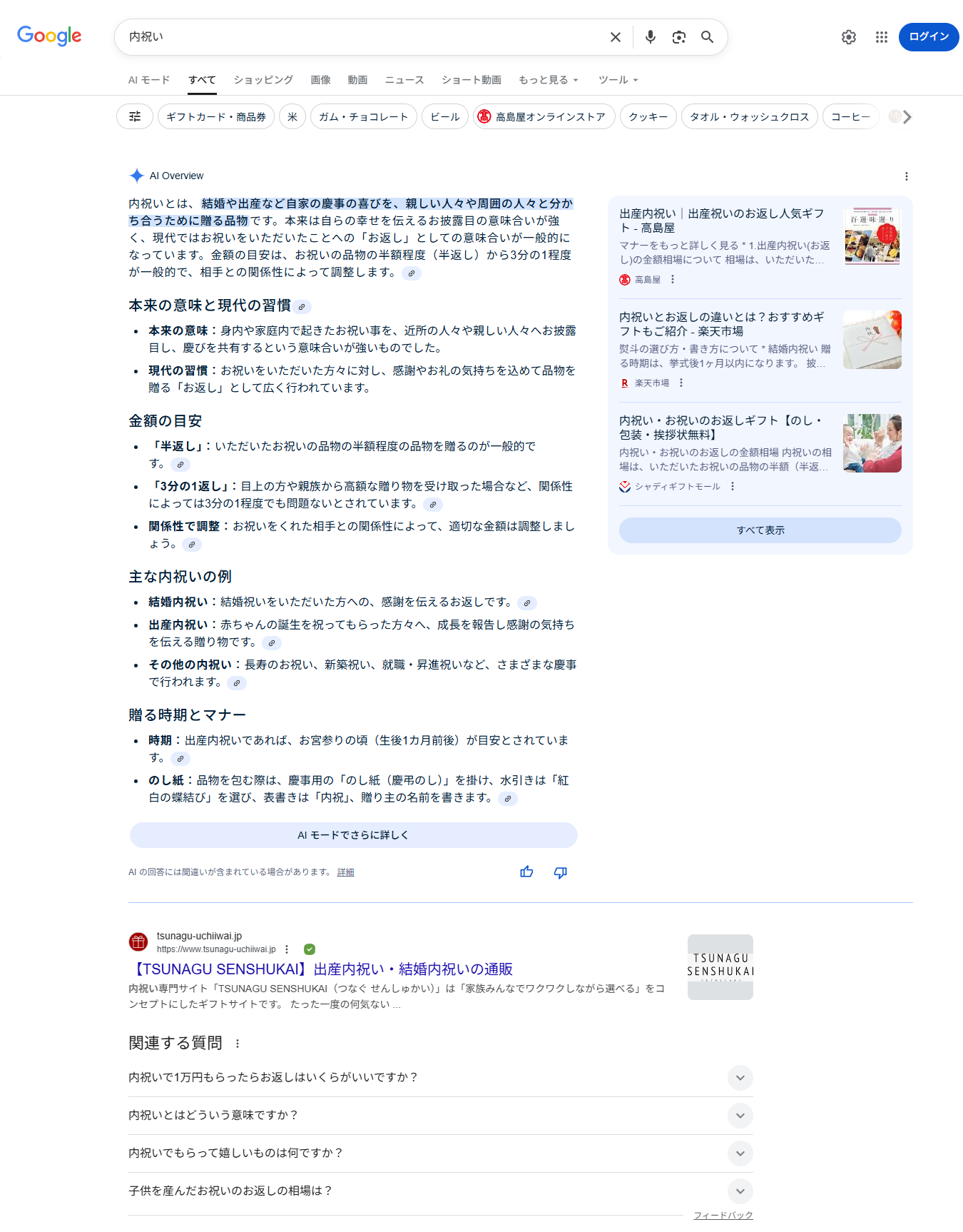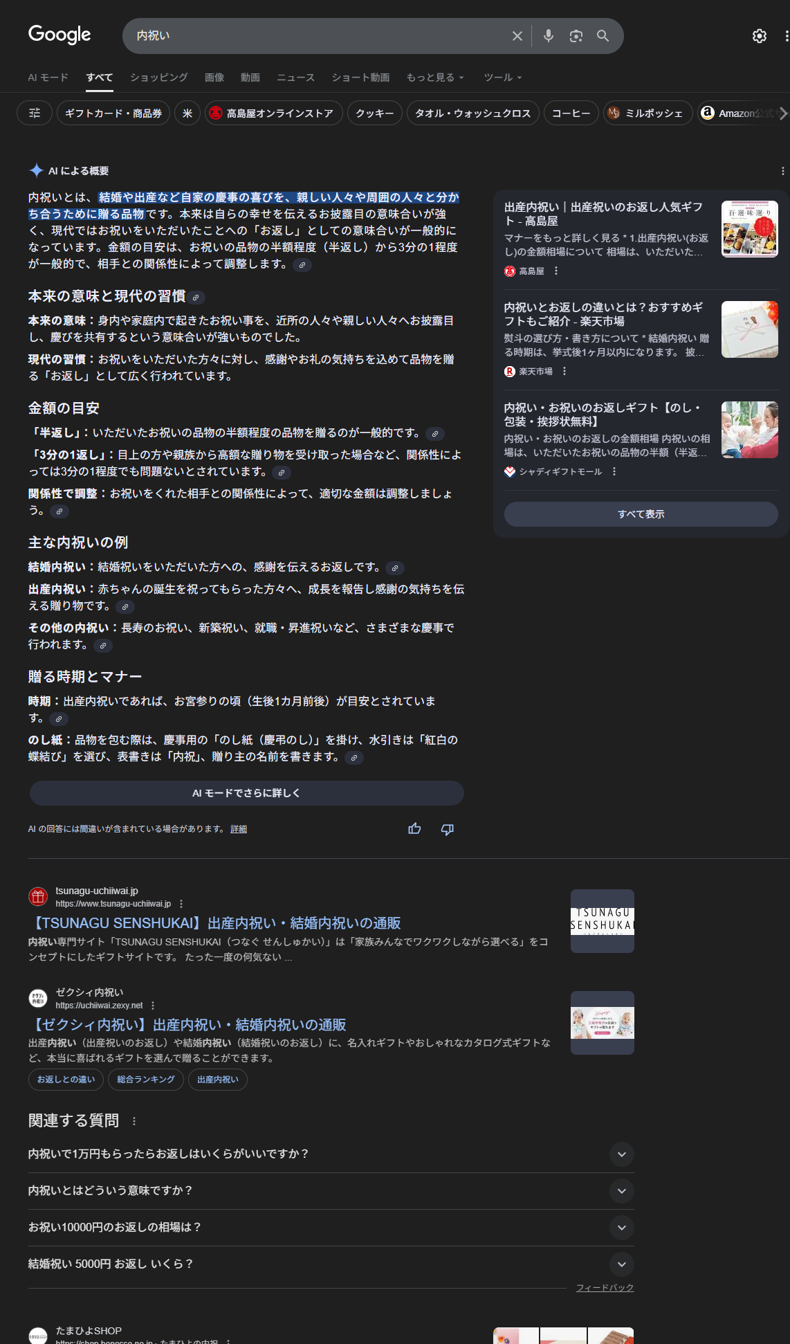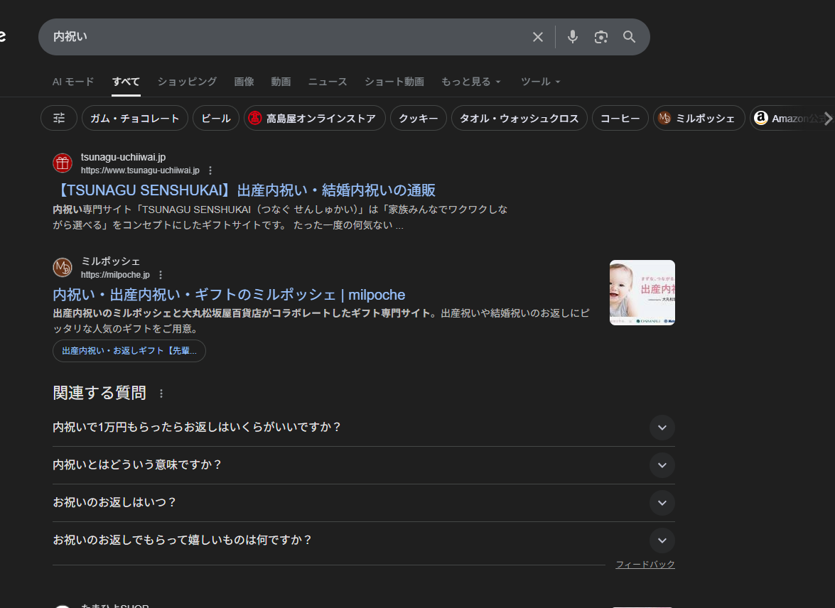 これまで見逃していたが、【クレジットカード おすすめ】では表立ってAI概要が見えなくても「関連する質問」を展開すると各質問ごとにAI概要が表示される仕様。文量は質問により若干増減するが通常と差異はなく、各質問に特化したAI概要を表示している。SERP上のAI概要露出は実質的に大幅増。AI機能搭載後も表示分散で最適化が進む。一方、【内祝い】の検索チップは高島屋・ミルポッシェに加えAmazonが追加され、視認性と購買導線が強化された。