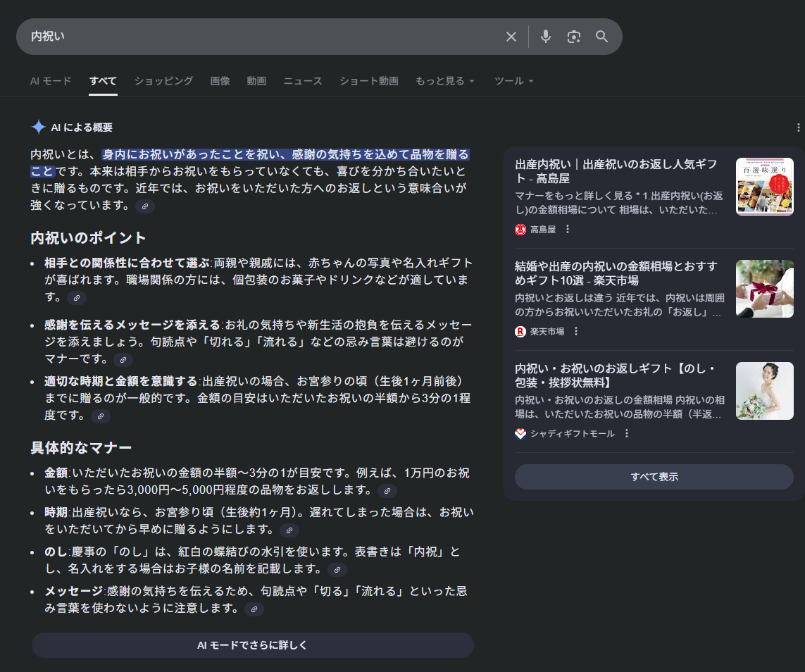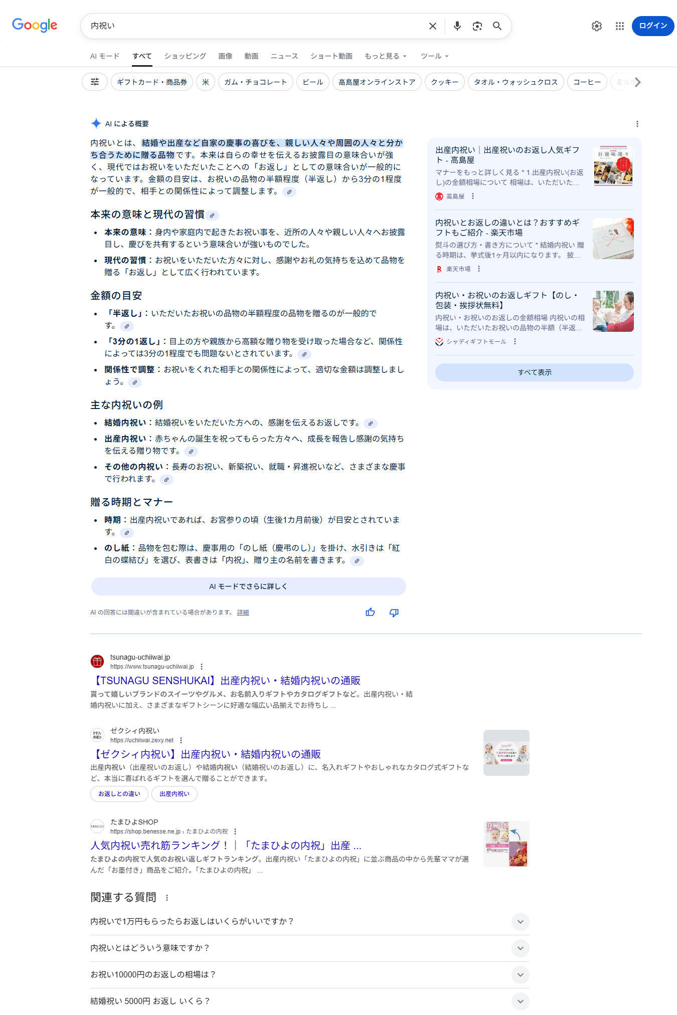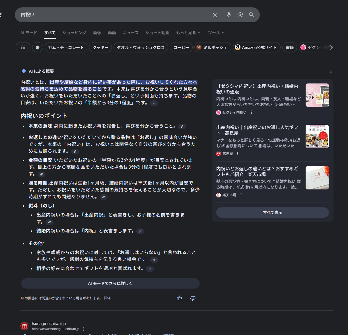 これまで見逃していたが、【クレジットカード おすすめ】では表立ってAI概要が見えなくても「関連する質問」を展開すると各質問ごとにAI概要が表示される仕様。文量は質問により若干増減するが通常と差異はなく、各質問に特化したAI概要を表示している。SERP上のAI概要露出は実質的に大幅増。AI機能搭載後も表示分散で最適化が進む。一方、【内祝い】の検索チップは高島屋・ミルポッシェに加えAmazonが追加され、視認性と購買導線が強化された。