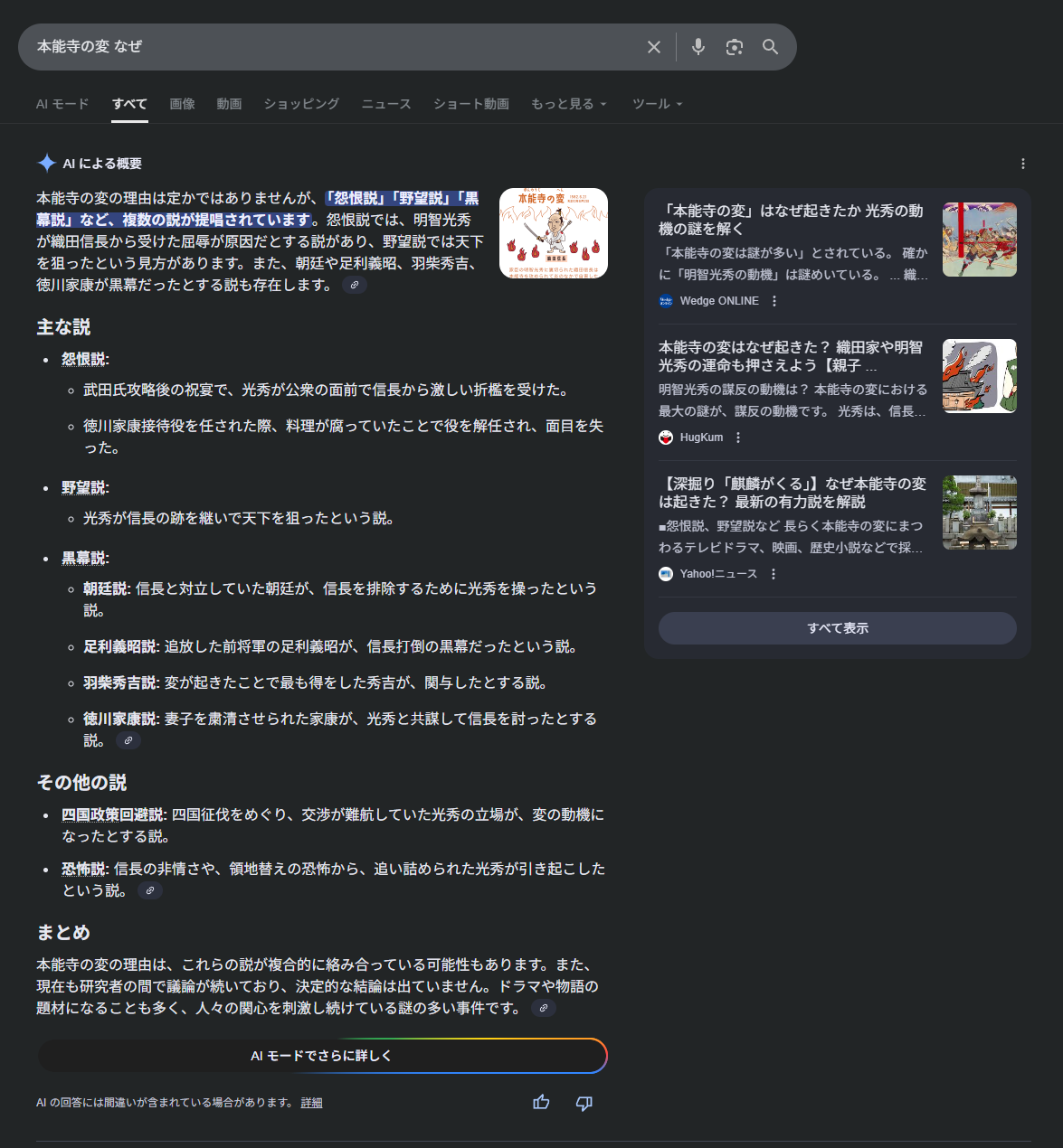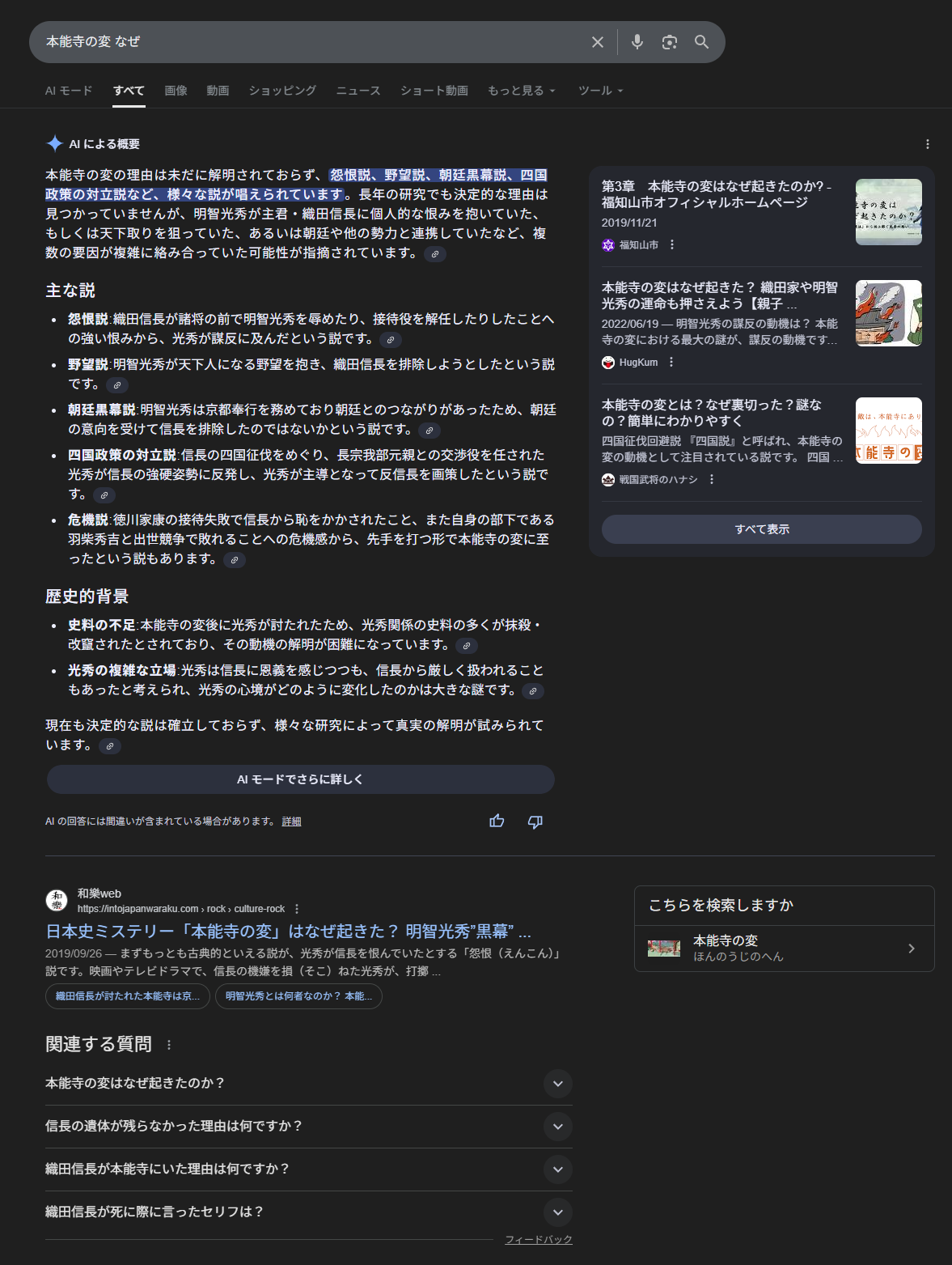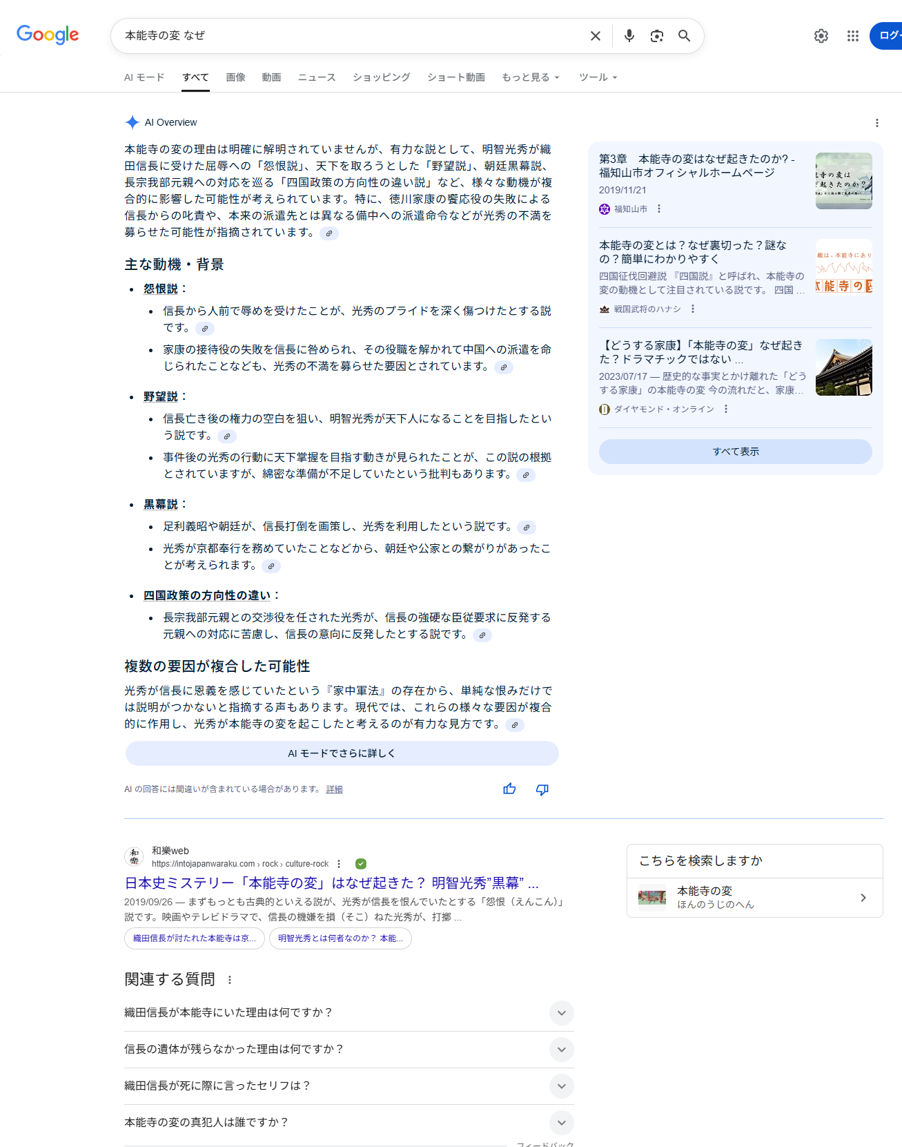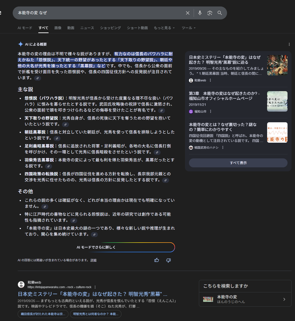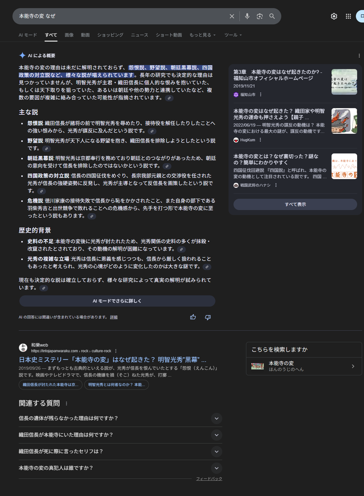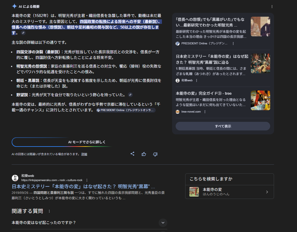 本日【クレジットカード おすすめ】では、おすすめ一覧や分類表の画像がSERPsに表示され、選択肢理解を促す“視覚フレンドリー化”が進行。一方【本能寺の変 なぜ】のAI概要は、参考URLの提示はなく、諸説の見出しに出元を直接併記(例:怨念説〈和歌山県立博物館の有力資料〉)する方式に。これまでもAI概要欄に引用サイトのURLを列挙して生成文の根拠を強調する傾向は見られたが、今回は根拠の見せ方そのものが変化。生成回答と根拠の対応が即時に分かるAI概要文に微調整。