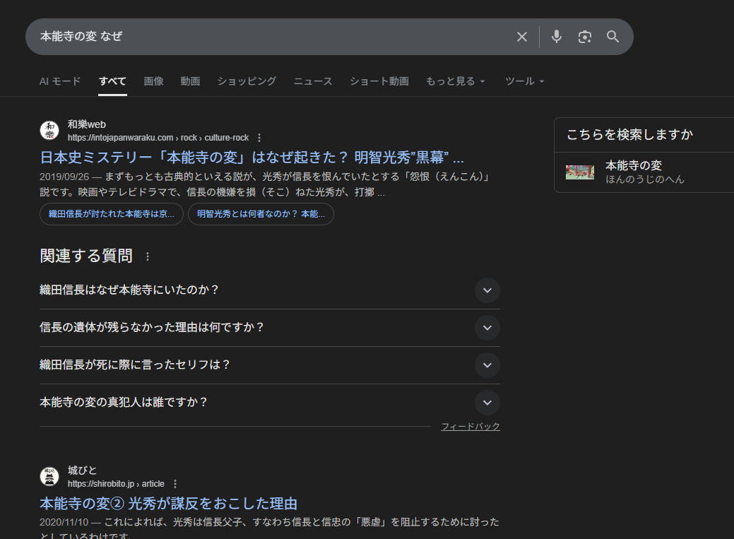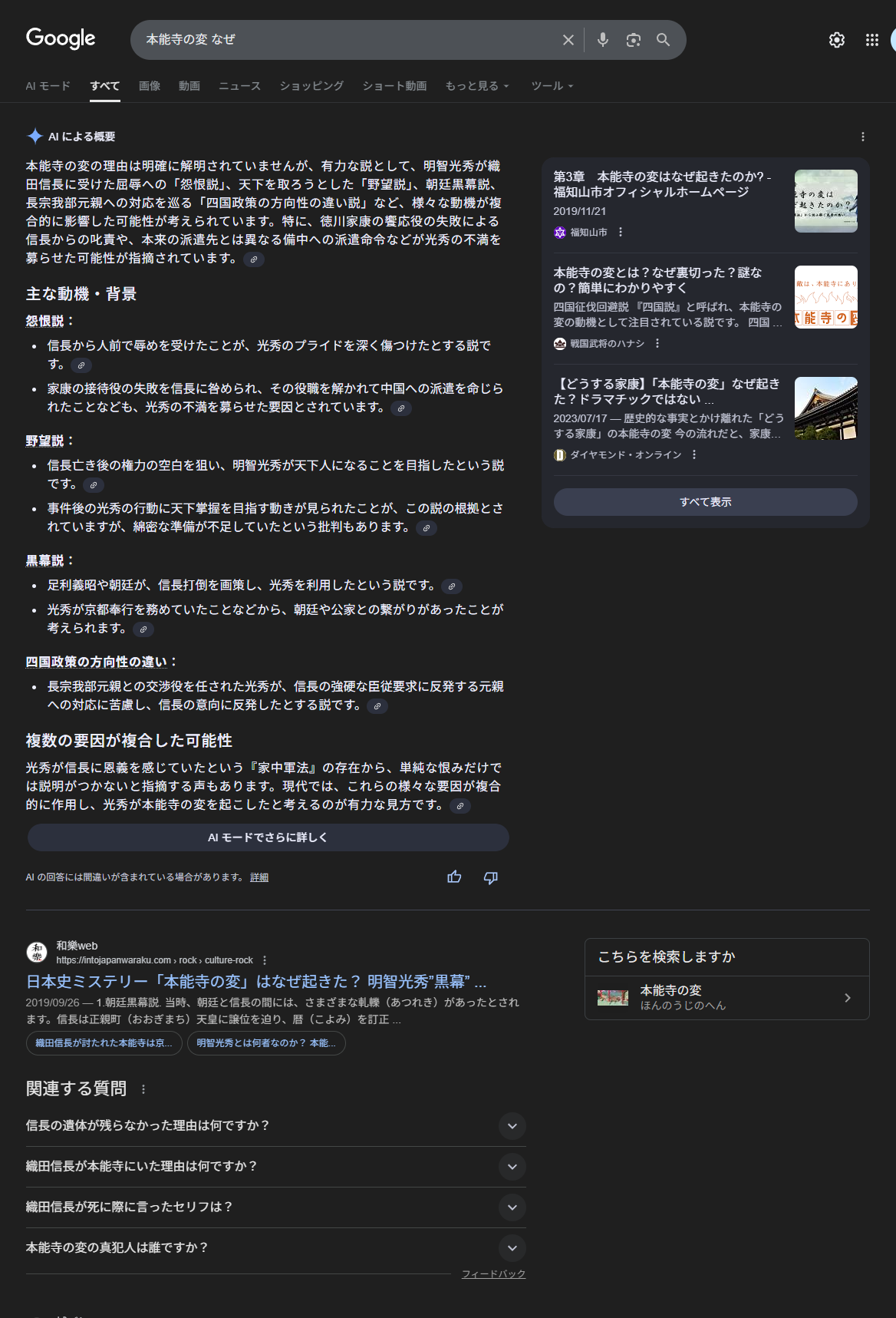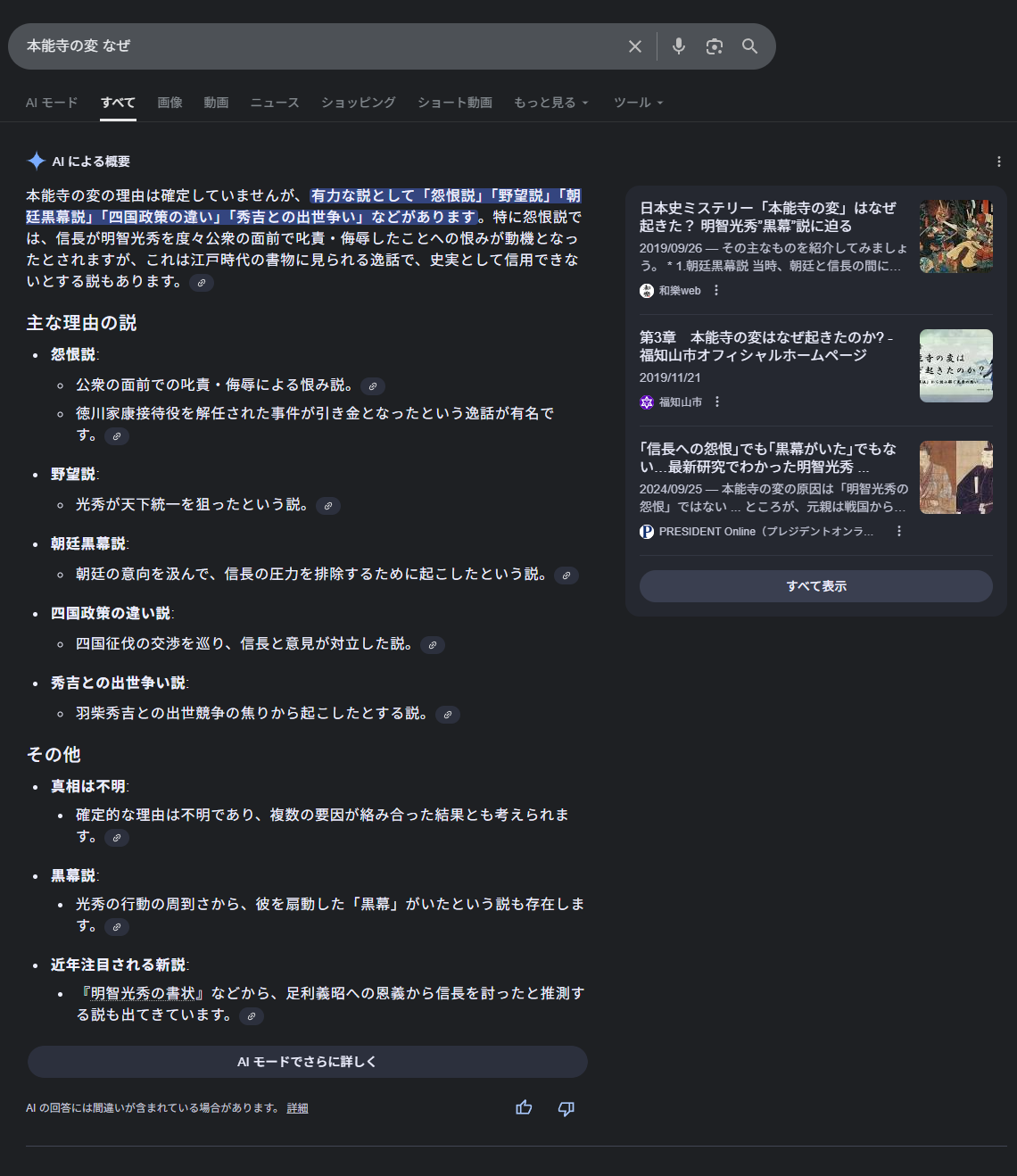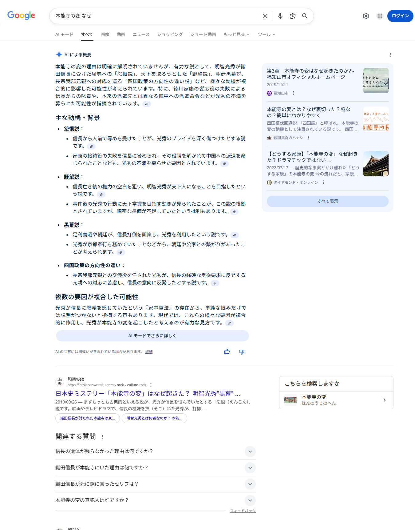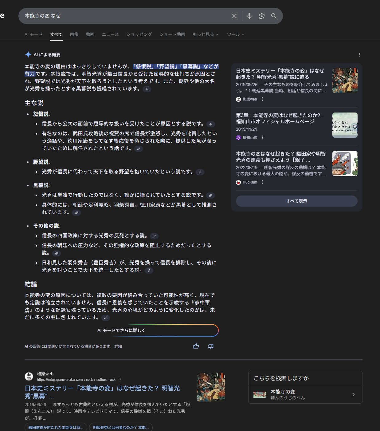 本日【クレジットカード おすすめ】では、おすすめ一覧や分類表の画像がSERPsに表示され、選択肢理解を促す“視覚フレンドリー化”が進行。一方【本能寺の変 なぜ】のAI概要は、参考URLの提示はなく、諸説の見出しに出元を直接併記(例:怨念説〈和歌山県立博物館の有力資料〉)する方式に。これまでもAI概要欄に引用サイトのURLを列挙して生成文の根拠を強調する傾向は見られたが、今回は根拠の見せ方そのものが変化。生成回答と根拠の対応が即時に分かるAI概要文に微調整。