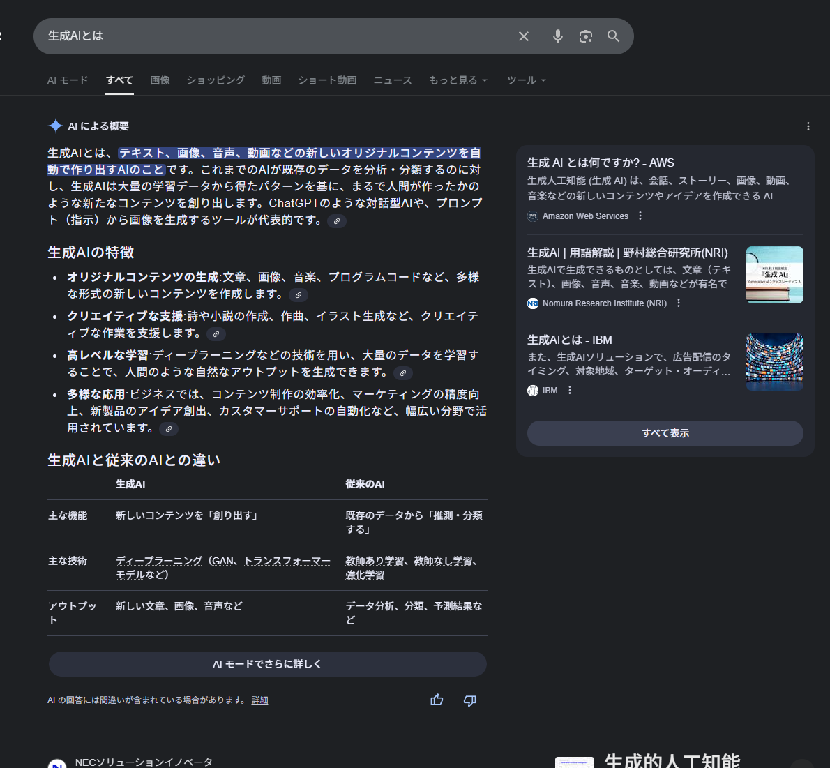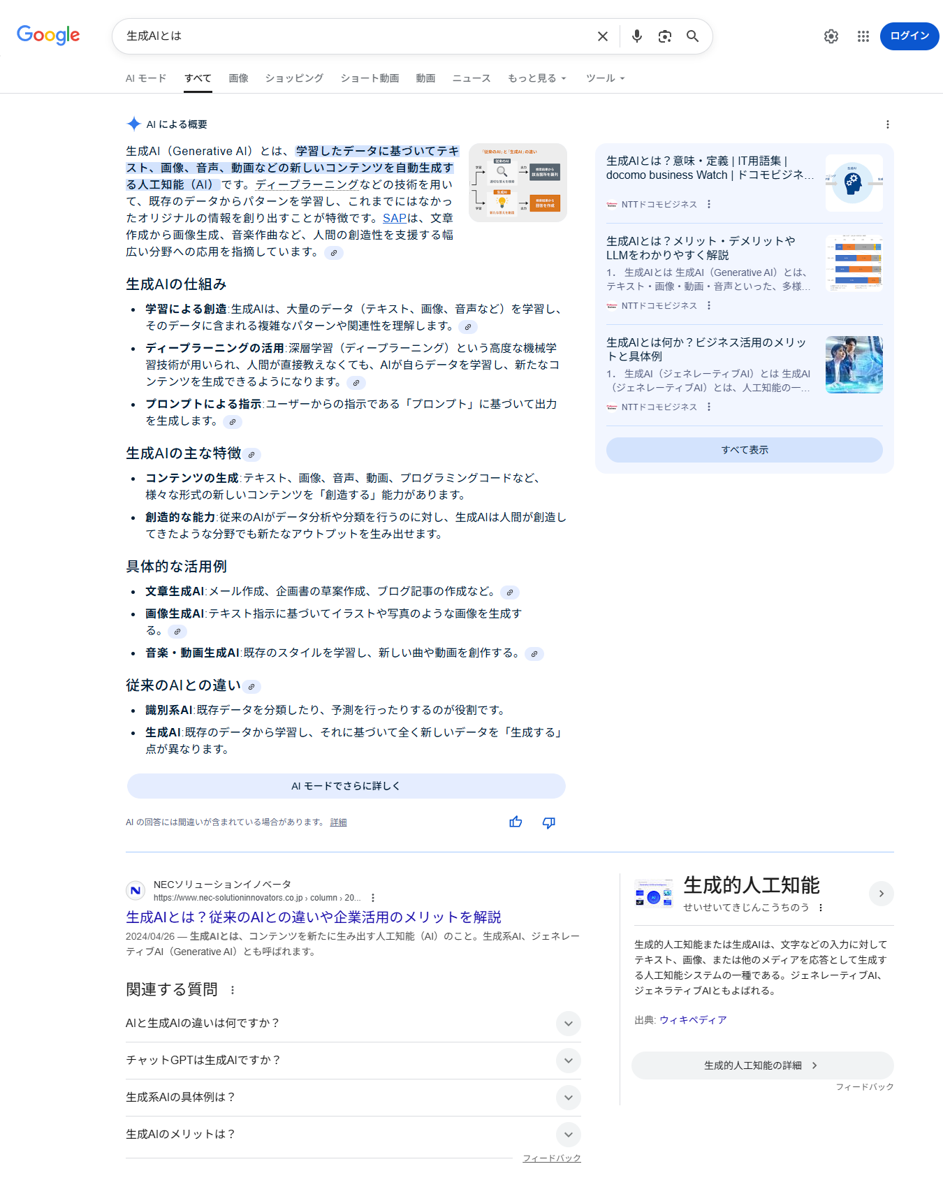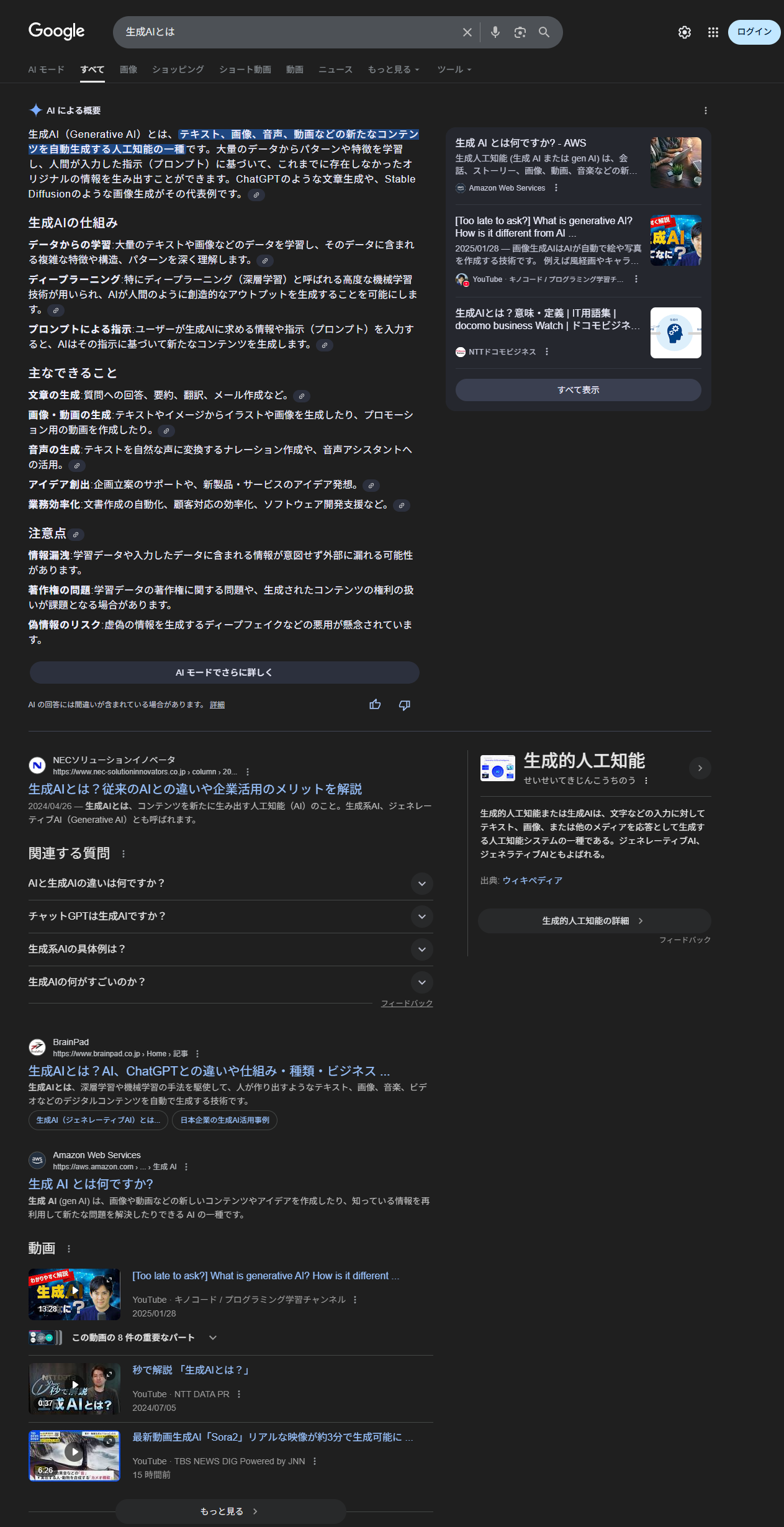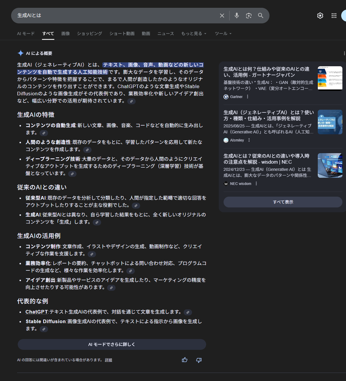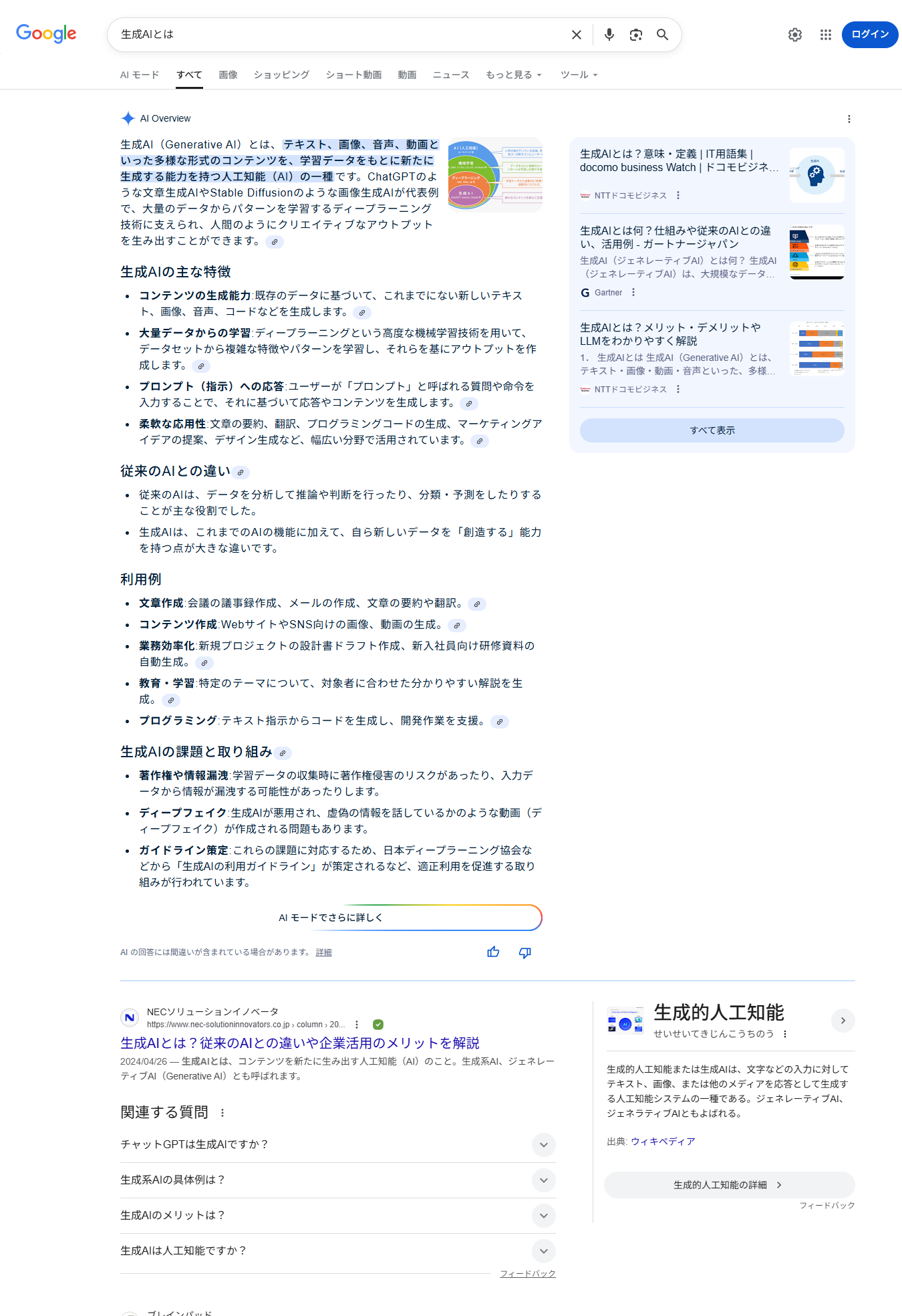今もなお、AI Overviewsが出現しない【クレジットカード おすすめ】に今回は動画が表示された。【生成AIとは】では根拠としても動画が含まれており、YouTubeの情報もAI Overviewsに引用されている。また、今までは「文章生成AI」や「画像生成AI」などの一般名称を説明していた具体例では、ChatGPTやStable Diffusionなどの固有名詞を説明する形に変わっている。【内祝い】は内祝いの内容を説明する傍ら、のし・包装に対応可能なギフトモールが表示されるなどよりシームレスな検索体験に近づいている。