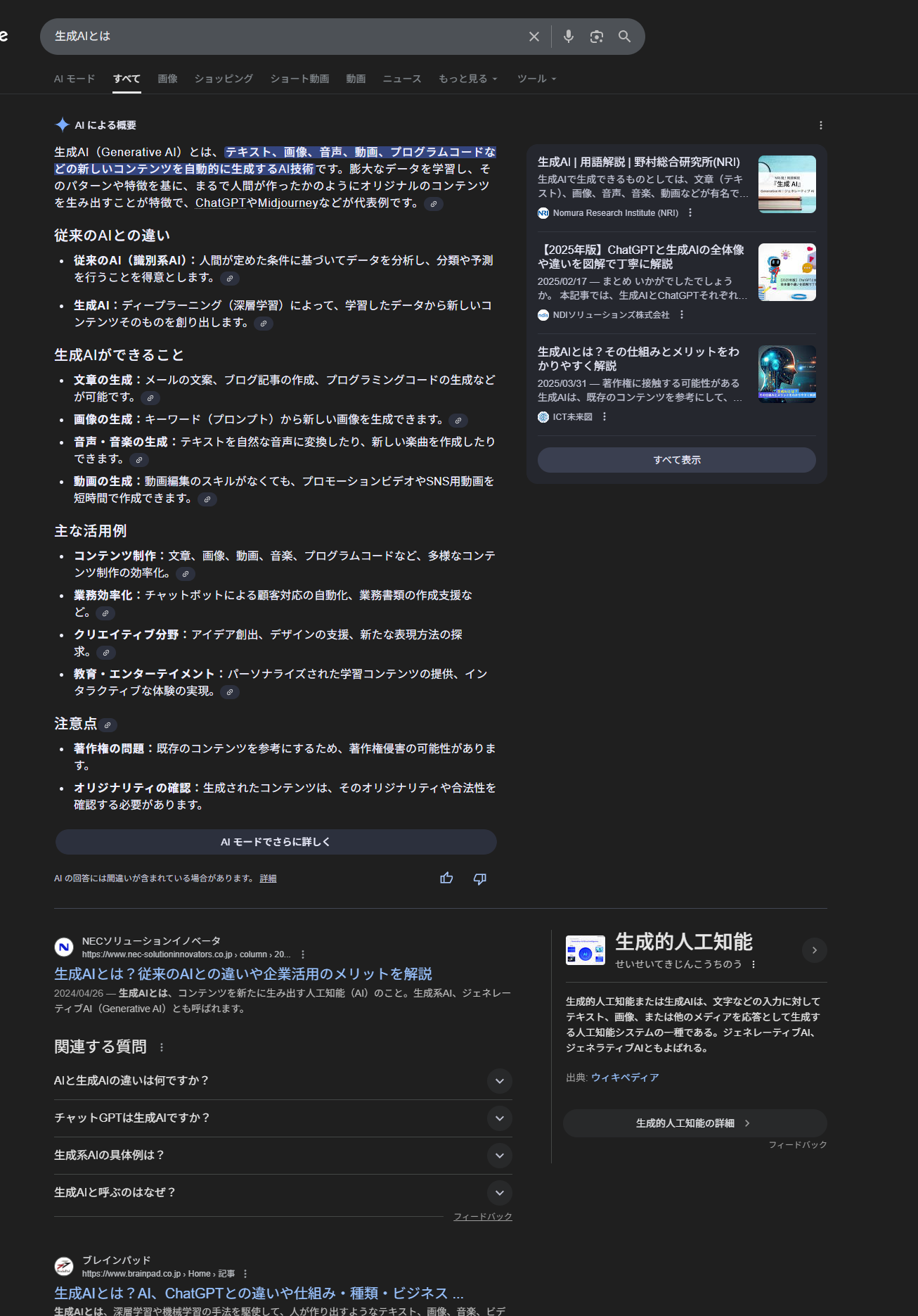 本日は複数のクエリで短文化が顕著に進行し、1文定義+要点提示の構成へ移行している。【生成AIとは】では説明文が顕著に簡潔化し、10日と比較すると全体的に20~40%ほど文章量が減少している。AIOverviewsの役割が「解説する」より「瞬時の理解性」へシフトしているように感じる。
