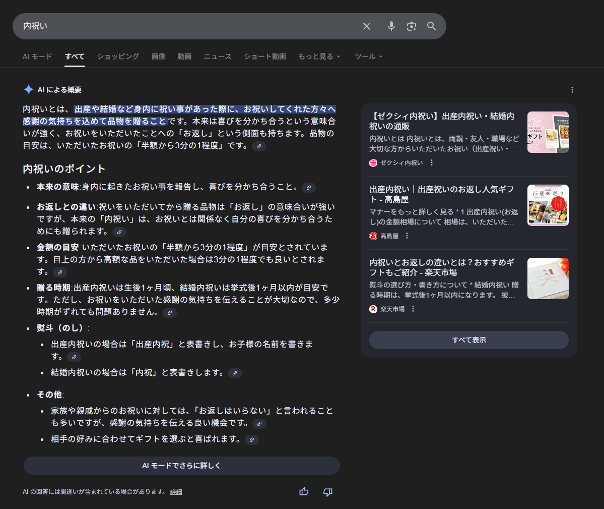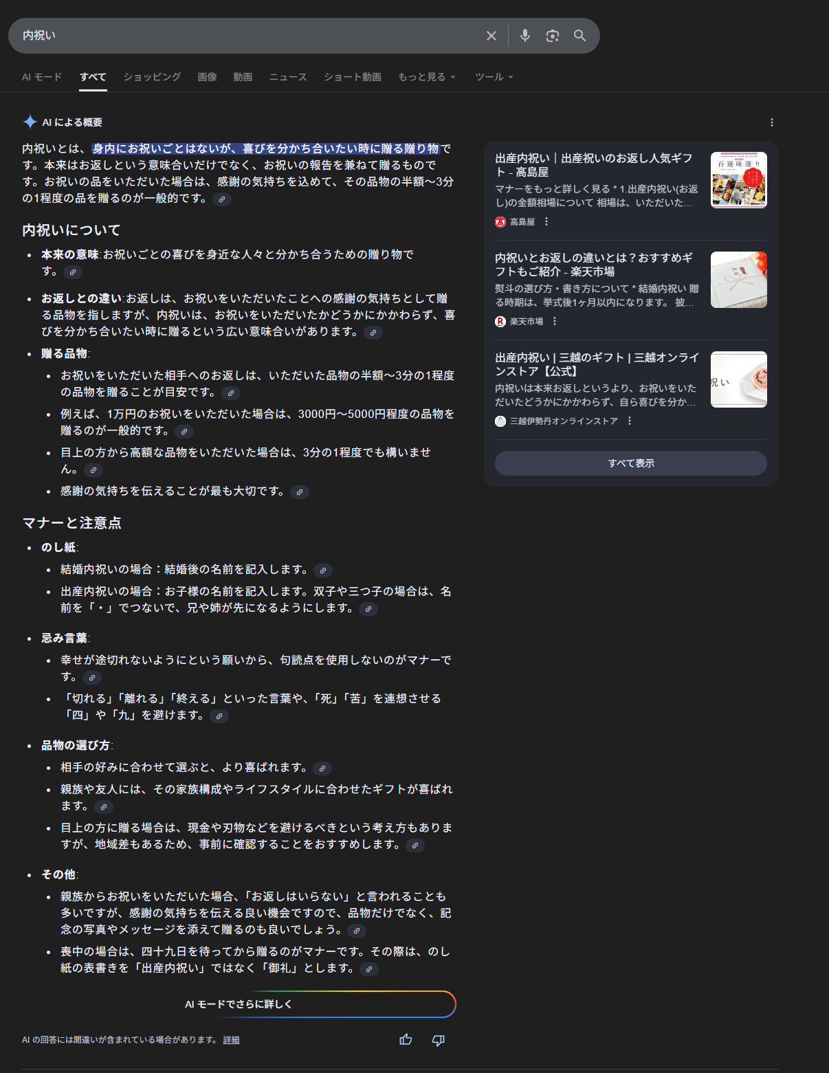 【クレジットカード おすすめ】でAI Overviewsは非表示のまま。購買型クエリは安定してAI生成が抑制される一方、SEOや生成AIなど情報型クエリでは教育的な整理が進行。内祝いは文化的背景を再度強調し、AIOverviewsは依然“買わせる”から“教える・伝える”方向への移行が続いている。
