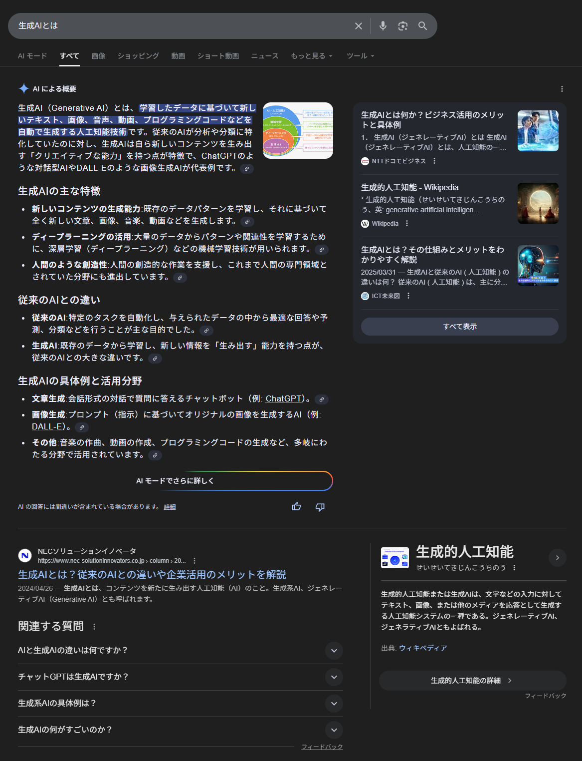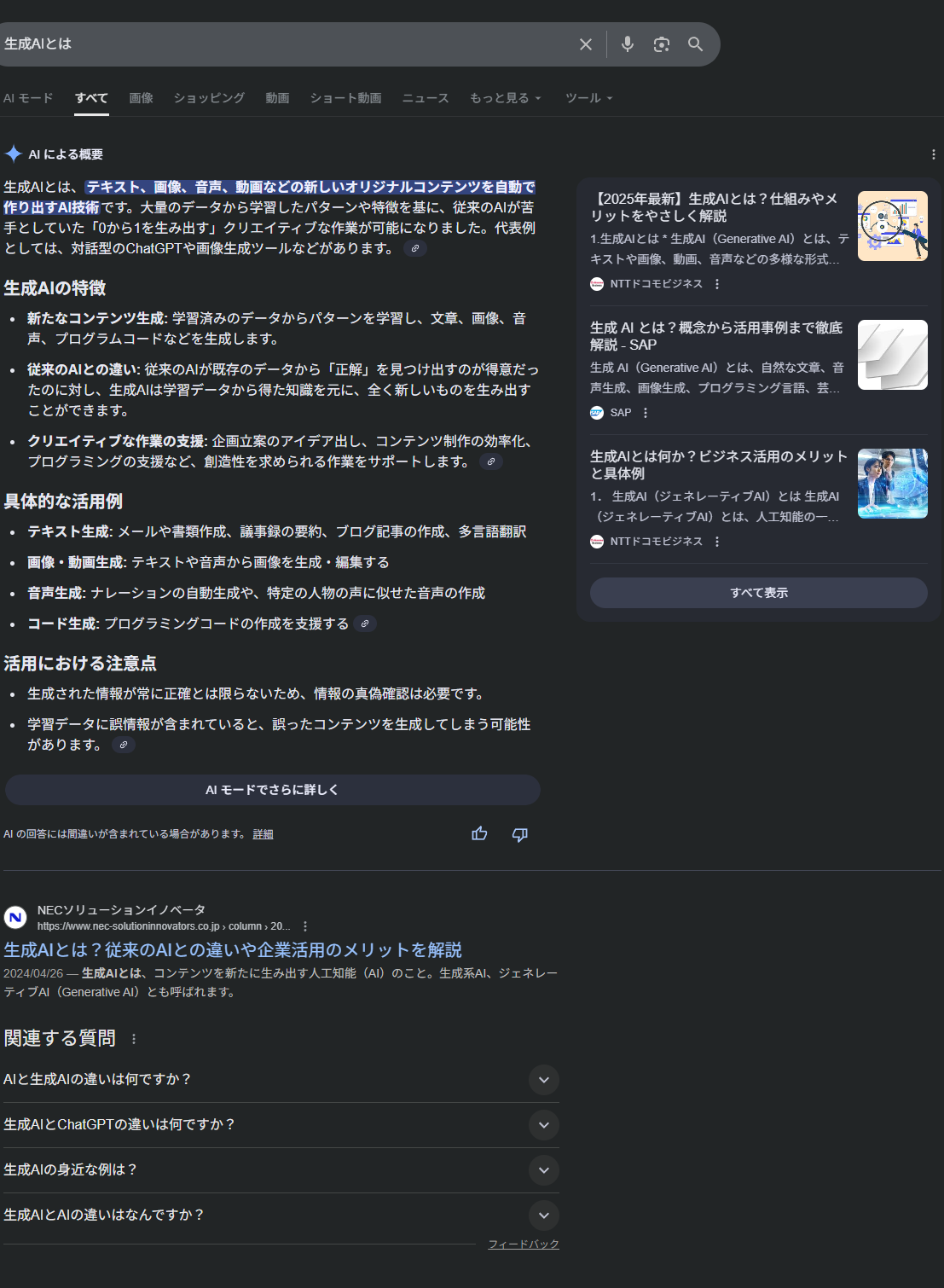 今日のAI Overviewsは、前回の短文化傾向から一転し、説明量が回復。特にSEOではAI生成コンテンツへの言及が削除され、従来型の構成に戻った。生成AIや本能寺の変では情報が厚くなり、短くするより「正確に伝える」方向へ舵を切った印象。AI概要は再び“知識の整理役”として安定化に向かっているのだろうか。