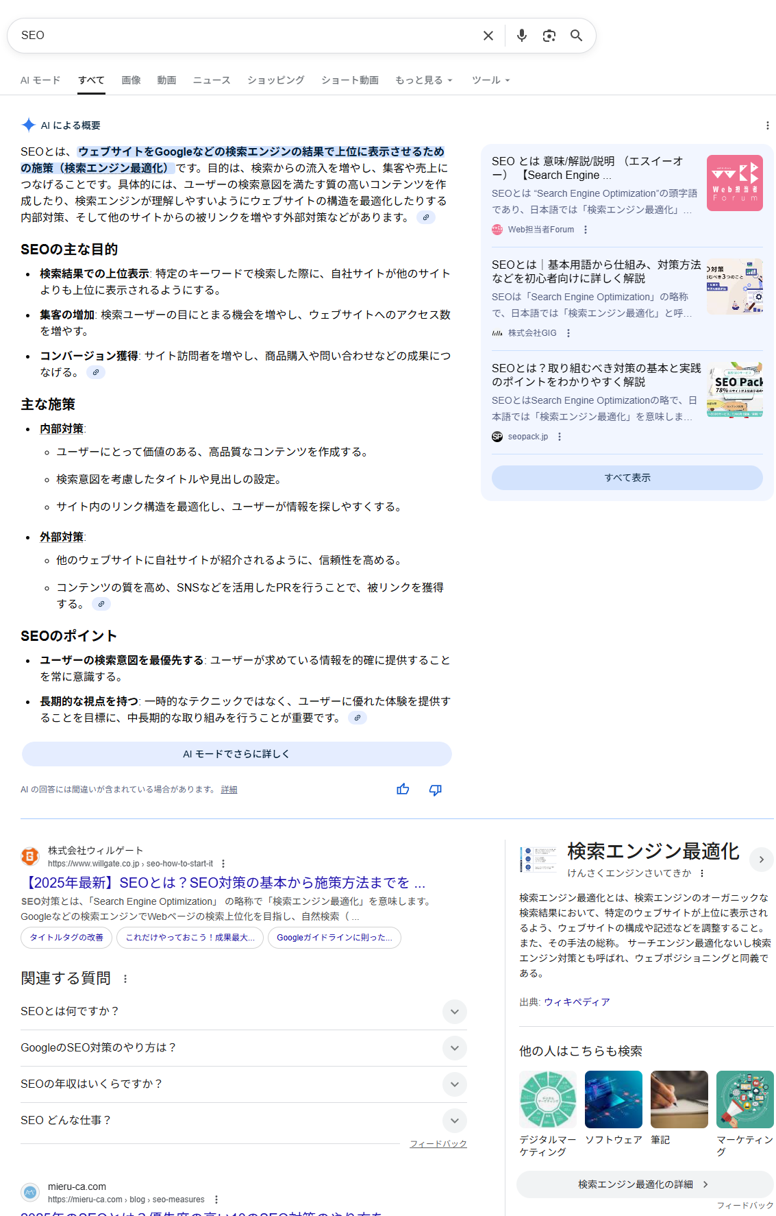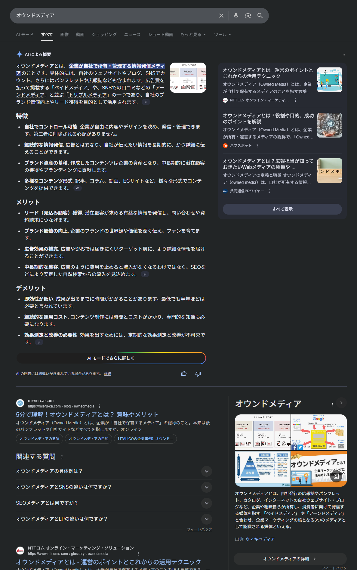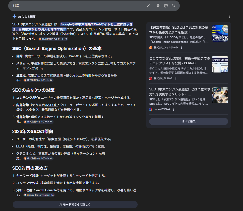 【SEO】では評価のために重視されるポイントの解説、【オウンドメディア】では代表例の紹介、【生成AIとは】では従来のAIと生成AIの違いを説明するなど、AI Overviews上に表示される内容に変更があった。また概要説明、メリットやポイント、具体例、デメリット・注意点というように、表示の順番も変更されている。リンクをクリックしなくてもAI Overviewsのみで欲しい情報のキャッチアップが可能になっているという点で満足度の向上が見られる。今後の変化も注目したい。