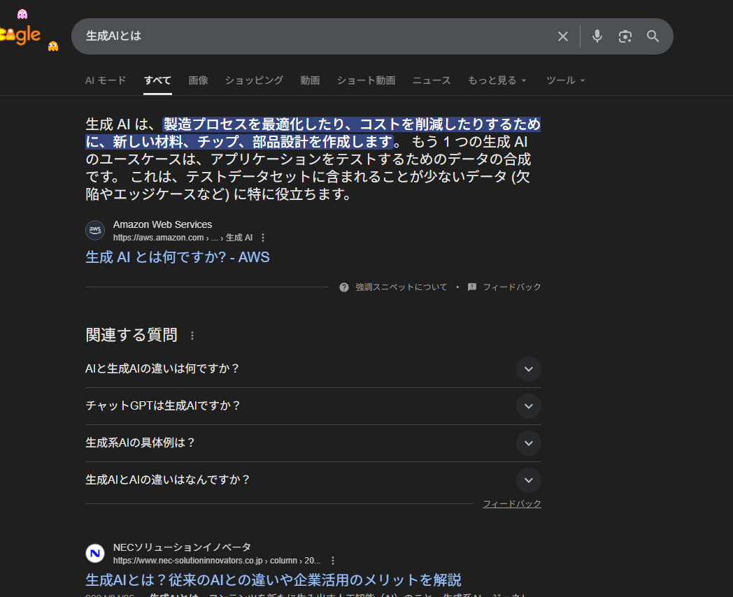 すべてのクエリでAI Overviews(AIによる概要)は出現せず、強調スニペットのみの表示となっている。特に「生成AIとは」では内容が製造業向けに置き換わり、今までとは違うテイストの文章が生成されている。次回はいつAI Overviewsが表示されるのか、経過が気になる。