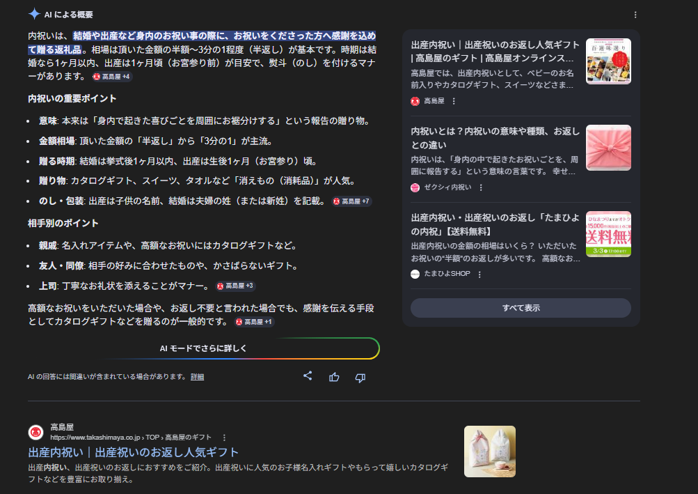 以前からAI Overviewsの出現が安定しない【クレジットカード おすすめ】で、AI Overviewsが出現している。内祝いにもみられるように目的別、相手別などといったよりユーザーの思考プロセスに沿った提案をしている。AI Overviewsは「答え」を出す場ではなく、信頼できるサイトへ繋ぐ「高機能なコンシェルジュ」へと変容していると言えるのではないだろうか。