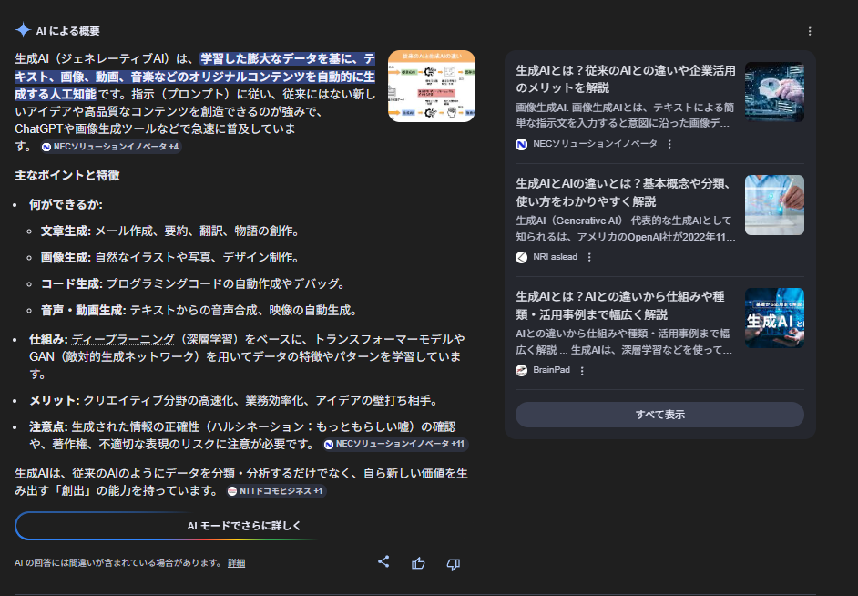 本日も【クレジットカード おすすめ】でAI概要が表示。導入の趣旨は前回同様“自分に合う使い勝手を重視して選ぶ”を踏まえつつ、今回は利用目的別の見出しと並びが変動。一方【生成AIとは】のSERPには「Xへの投稿」枠が出現し、最新の投稿が露出。現時点でAI概要本文への反映はみられなかったが、速報性の高いテーマではX発の情報がAI概要に拾われる可能性が垣間見える。