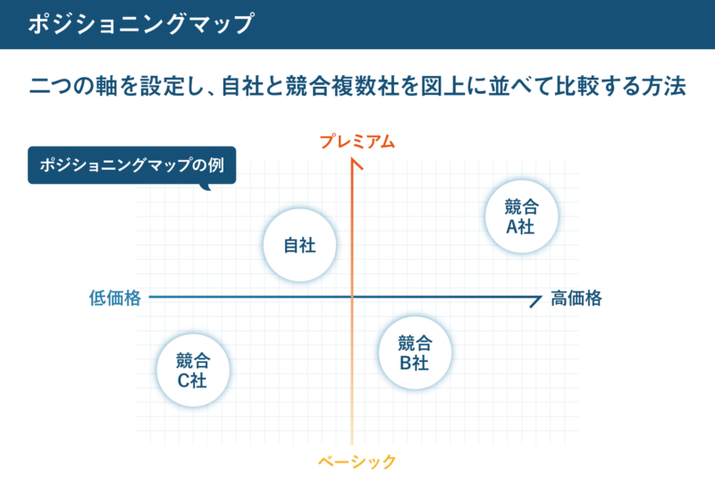価格や機能など二つの軸を設定し、自社と競合複数社を図上に並べて比較する方法です。
