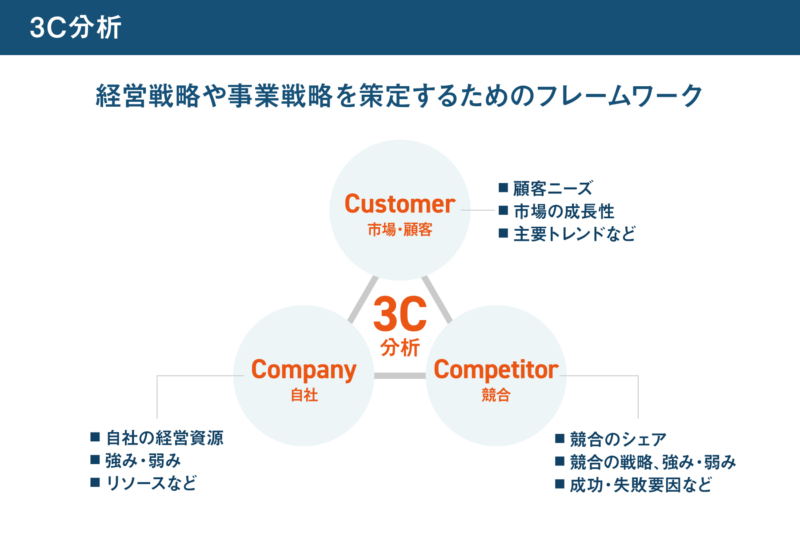 自社、顧客、競合の三つの視点から市場環境を整理する方法です。