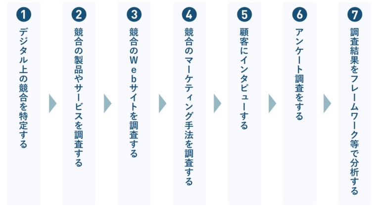 デジタルマーケティングにおいて、サービス・Webサイト・マーケティングすべての項目にて競合調査を行う場合は、おおよそこのようなステップで進めます。参考にしてください。