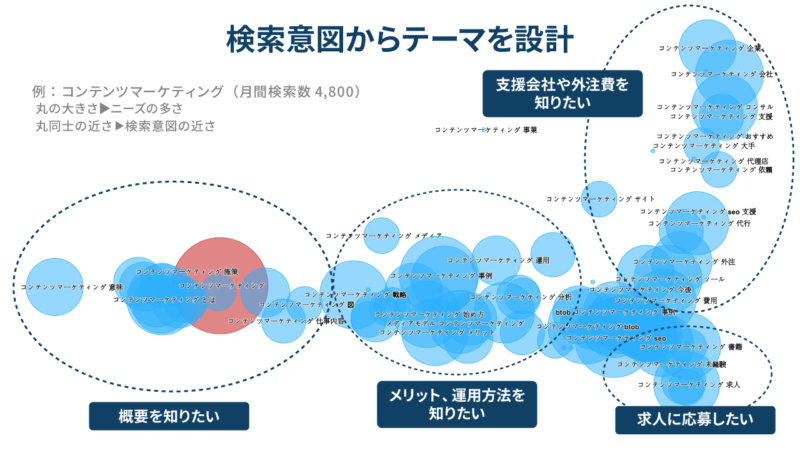 キーワードから検索ニーズ(=検索意図)を探し、検索者の欲しいコンテンツを作成することができます。テーマは初期に30~100本ほど作っておき、コンテンツを制作・運用しながら追加していく方法がおすすめです。