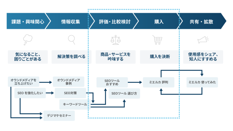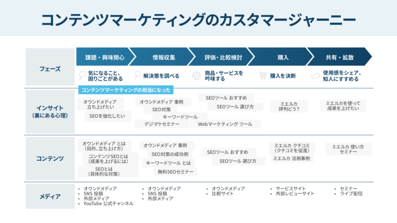 ある程度成果への道すじが見えてきたところで、より潜在的なニーズを持つ「課題・興味関心」「情報収集」フェーズ向けのコンテンツへテーマを拡張していくほうが、周囲の納得感も得やすいのではないでしょうか。