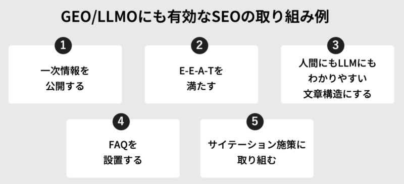 以下は、とくにGEO/LLMOにも有効なSEOの取り組み例です。