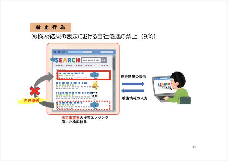 スマホ法・第九条は、検索エンジンに関する規制を扱っています。内容を端的に言いますと、検索エンジン事業者が検索の結果において自社のサービスを正当な理由なく優遇すること、いわゆる「自社優遇」や「優先表示」を禁じるものです。