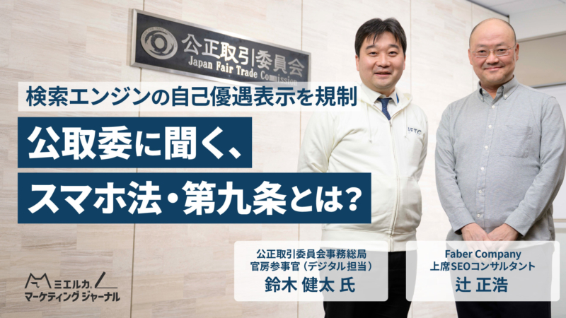 スマホ法の成り立ち、第九条の具体的な内容、そして事業者が取るべきアクションについて、公正取引委員会事務総局 官房参事官(デジタル担当) 鈴木健太氏にうかがいました。聞き手は、株式会社Faber Company(ファベルカンパニー)上席SEOコンサルタント・辻 正浩です。