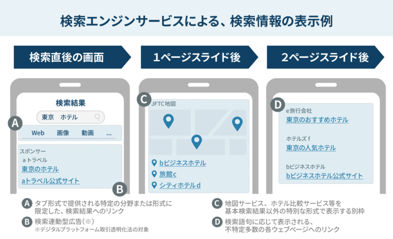 「検索における順位変動で自社が不利になった」というだけでは、スマホ法の対象には当たらないのですね。