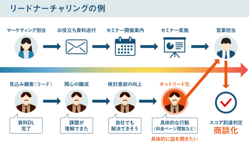 このプロセスを押さえておくと、各フェーズで「何をすべきか」「どこまでがナーチャリングなのか」が明確になり、成果につながる施策設計が可能になります。