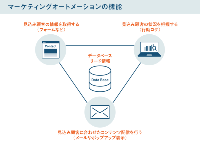 | 具体的な施策 | 資料DL・セミナー・広告などで連絡先を取得 | メール配信・コンテンツ提供・セミナー案内など | スコアリング・タグ付け・営業引き渡し判断 |