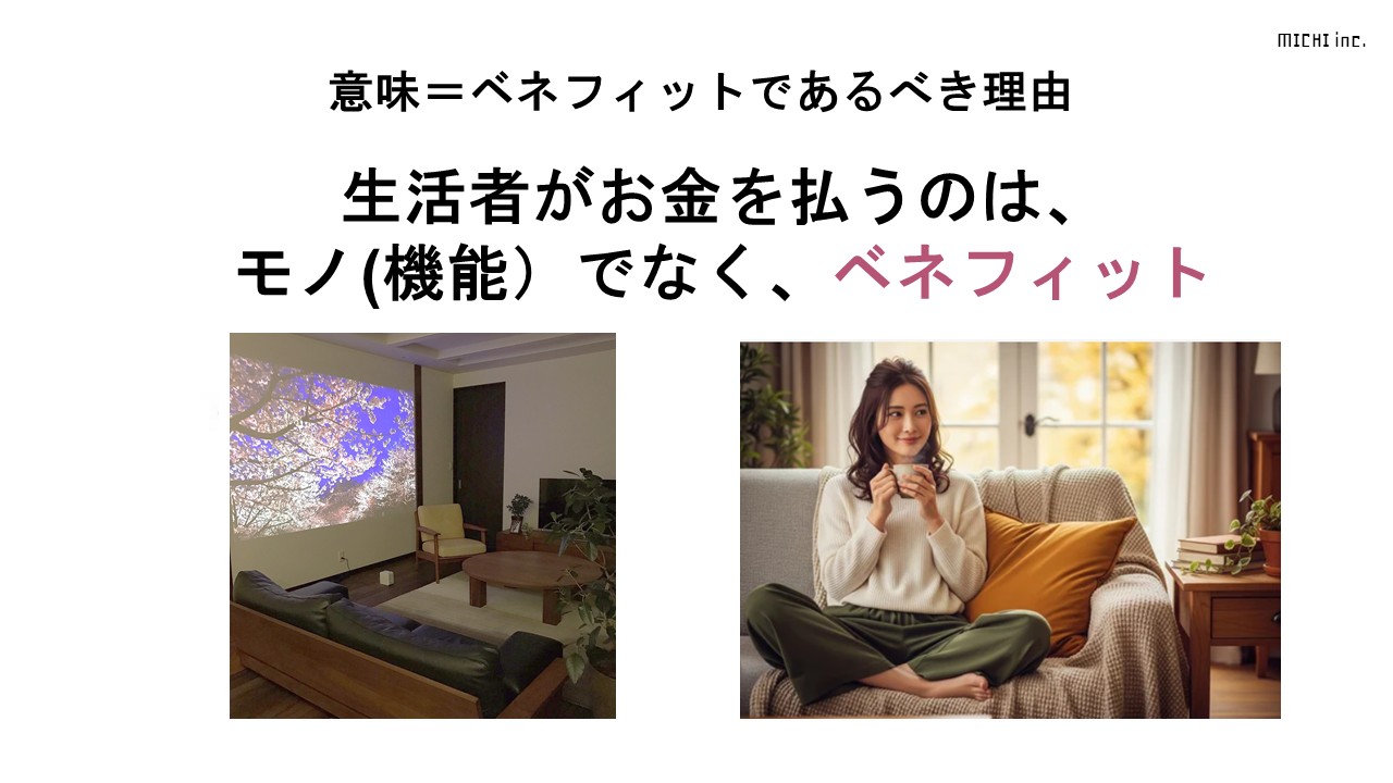 北原氏は、ブランドを「意味=ベネフィット(価値)=相手に起こる良い変化」と定義したうえで、私たち生活者がお金を払うのは機能ではなくベネフィットだと語りました。