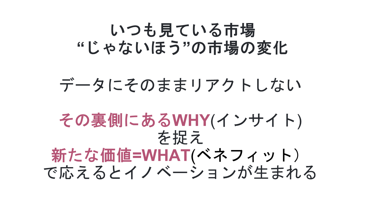 さらに新しいベネフィットを生み出すには、常に見ている市場ではなく「じゃないほう」の市場を見ることも大切だと提言。データだけでなく異なる市場のインサイトを捉え、ベネフィットで応えることで新しい変化を社会にもたらすと強調されました。ご参加の皆さまが深く頷いていたように思います。
