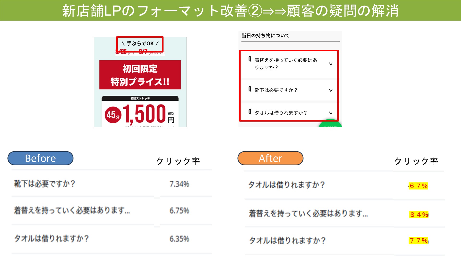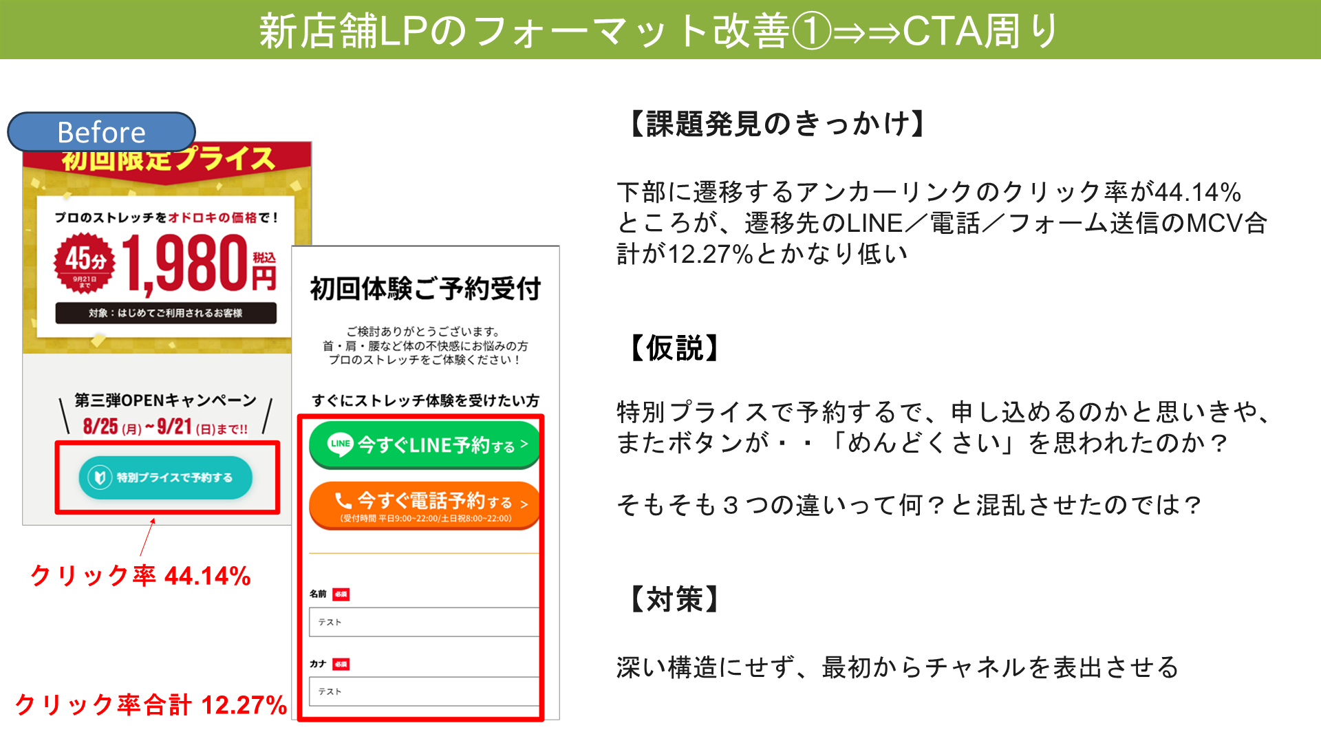 CRO改善では「どこから手をつけるべきか」「数値の基準が分からない」といった課題があったとのこと。実際に「ミエルカヒートマップ」を使い、新店舗LPを改善。CTAの文言・位置の見直しやFAQ設置などを行い、成果につなげた事例をお話しいただきました。