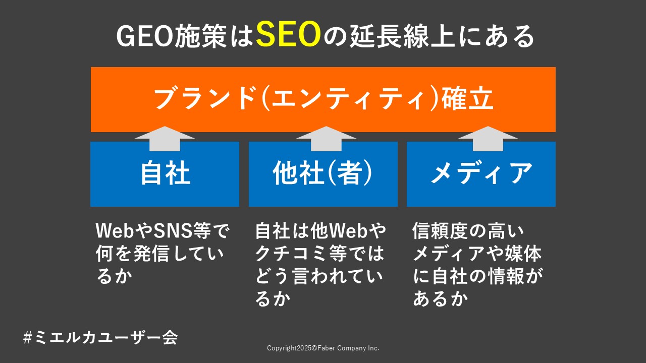 進化の早いAI領域は不確定要素が多く、特別な施策も明日も有効かどうかわかりません。そしてSEOで良いとされている多くのことは、AI検索にも有効である可能性が高い。そのような現状を見るに、基本的に、今できるGEO施策はSEOの延長線上にあります。