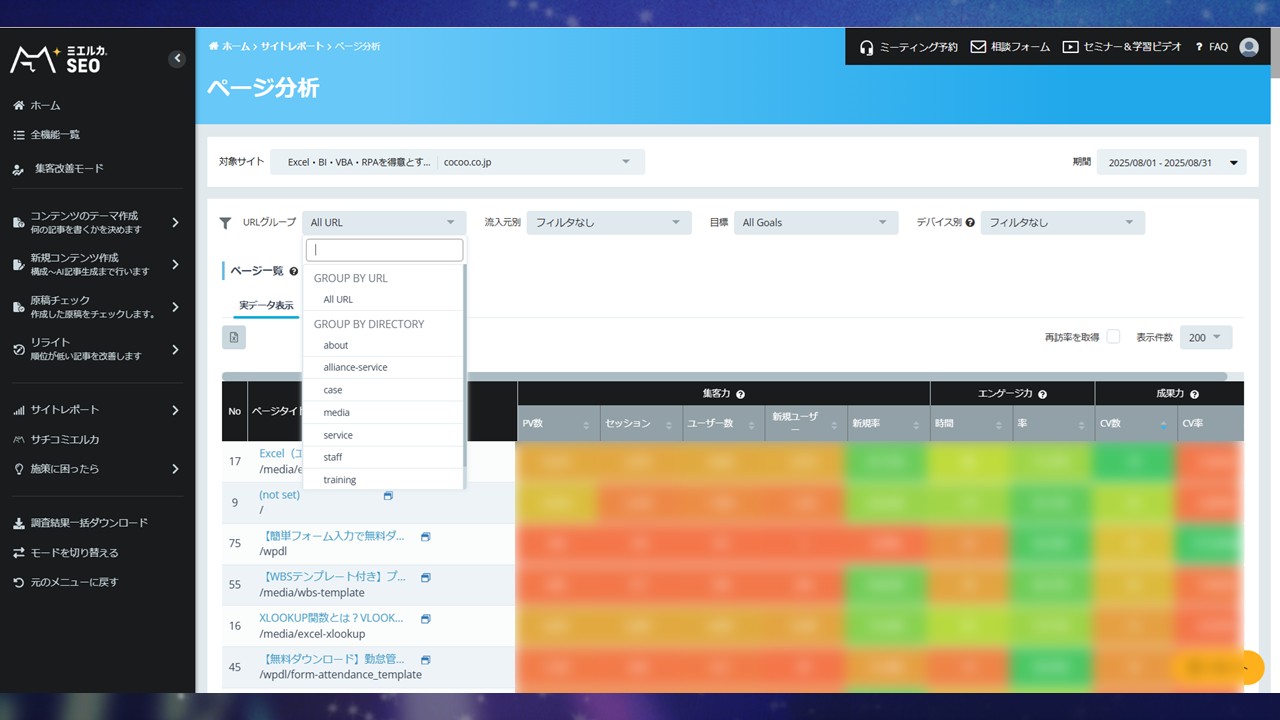 コクーさまは「ミエルカSEO」の分析機能を中心に活用。