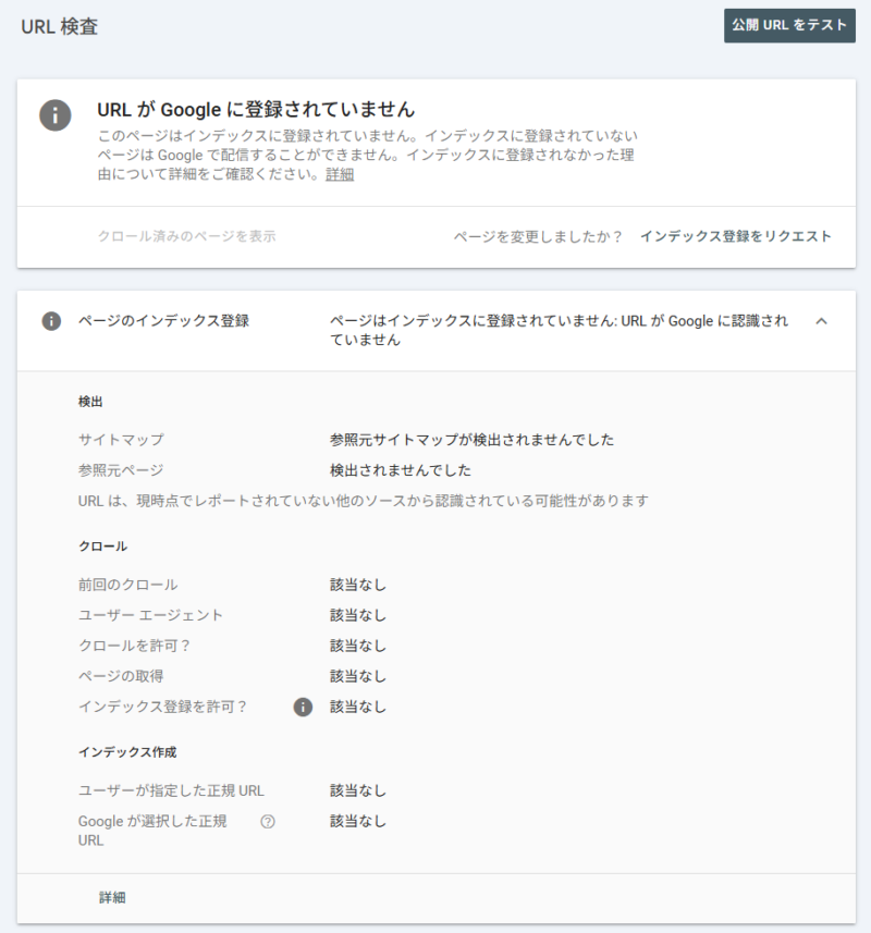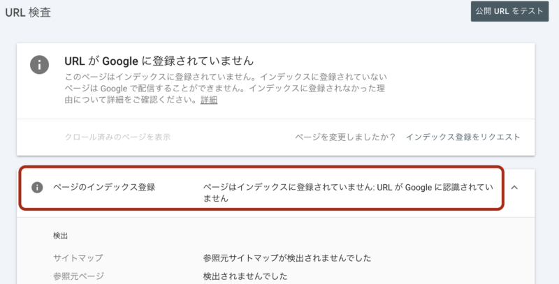 URL検査ツールに対象ページのURLを入力すると「ページのインデックス登録」の右にステータスが表示されます。このステータスと、その下の詳細メッセージが原因のヒントになります。