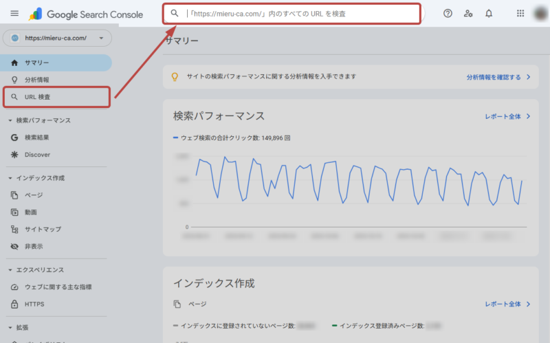 下記図のように、サーチコンソールのTOP画面・左メニューの「URL検査」をクリックしてください。上部の検索窓に、確認したいページのURLを入力すると、そのURLが現在Googleにインデックスされているかどうかのステータスが表示されます。