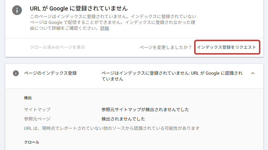 中には「クロール済み – インデックス未登録」というステータスもあり、クロールはされているけど、何らかの理由で登録されていない状態もあります。そんなときはインデックス登録をリクエストしましょう。