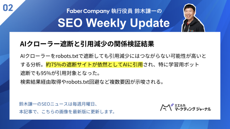 鈴木謙一の運営する「海外SEO情報ブログ」では最新情報をキャッチアップできます。さらに、当社が運営するYouTube「ミエルカチャンネル」では定期的にSEO情報を発信しています。Google社のGary Illyes氏やJohn Mueller氏、SEOの世界的権威であるリリー・レイ氏にも鈴木謙一が直接インタビュー。貴重な動画盛りだくさんですので、ぜひチャンネル登録しておいてください。