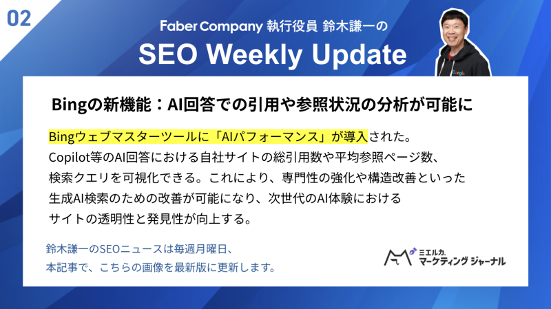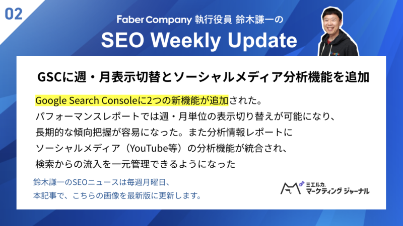 SEO Weekly Update(週刊SEOニュース)更新のお知らせは、当社公式のミエルカくんX(旧twitter)で告知予定です。Xではお知らせ用として画像を1枚だけ掲載していますが、本記事ではすべての画像を掲載します。ぜひ最新のSEO動向をチェックしてください。