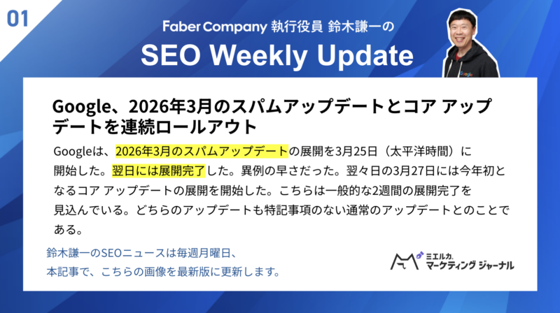 ※本記事の下部にて、SEOニュースのサマリー画像を毎週更新中! 最新画像は2026.03.30更新。ぜひクリックしてください