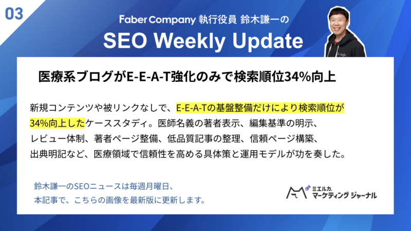 鈴木謙一の運営する「海外SEO情報ブログ」では最新情報をキャッチアップできます。さらに、当社が運営するYouTube「ミエルカチャンネル」では定期的にSEO情報を発信しています。Google社のGary Illyes氏やJohn Mueller氏、SEOの世界的権威であるリリー・レイ氏にも鈴木謙一が直接インタビュー。貴重な動画盛りだくさんですので、ぜひチャンネル登録しておいてください。