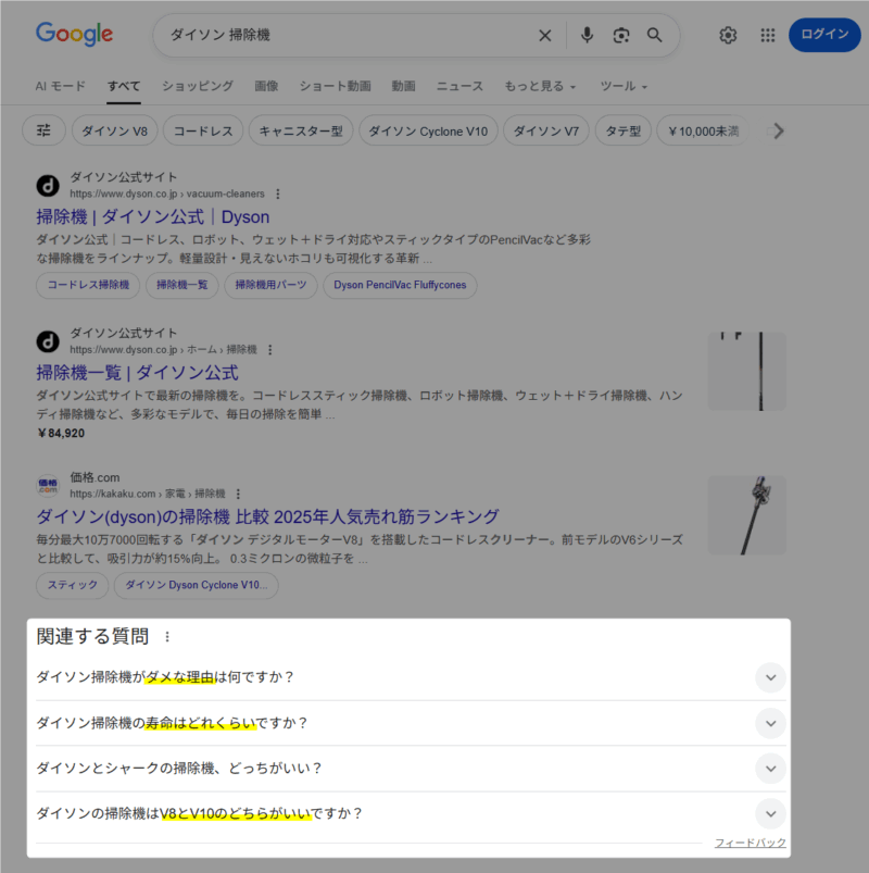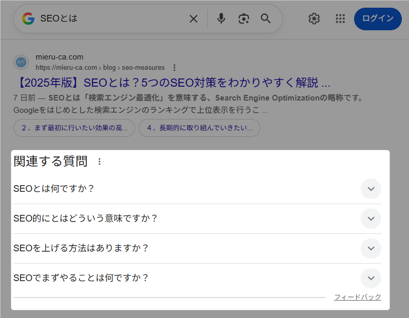 | 表示場所 | 検索結果の上部〜中部に「関連する質問」として表示 |