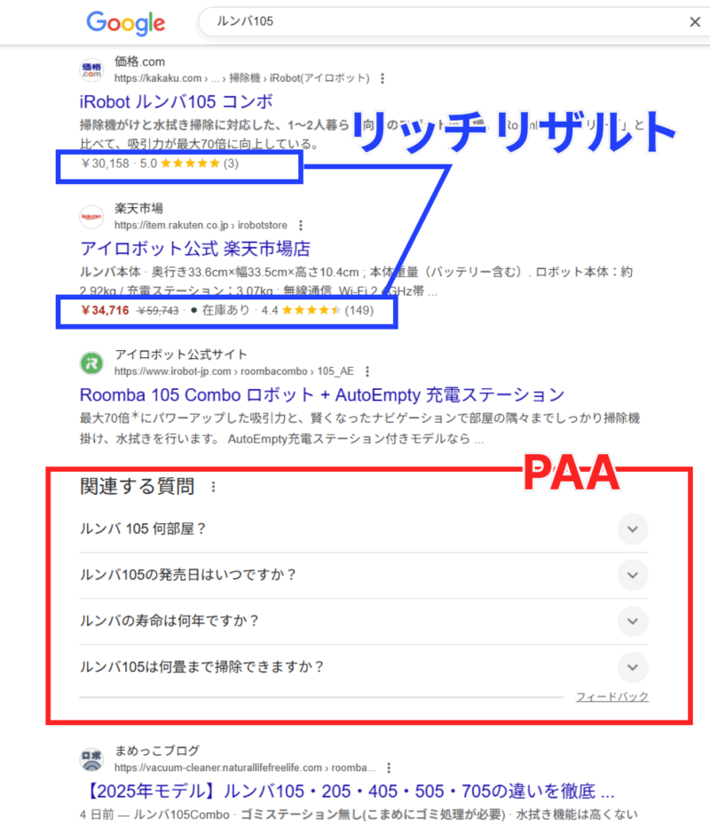 | 定義 | 検索ユーザーが興味を持つ「関連する質問」を自動表示するGoogleの機能 | 構造化データに基づいて、検索結果に追加情報(星評価・FAQ・商品画像など)を表示する形式 ※FAQは信頼のおける政府Webサイトおよび医療Webサイトに対してのみ表示 |