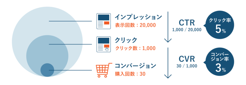 これらは「表示 → クリック → コンバージョン」という流れでつながっており、それぞれの数値を分けて見ることで、どこに改善の余地があるのかを把握できます。